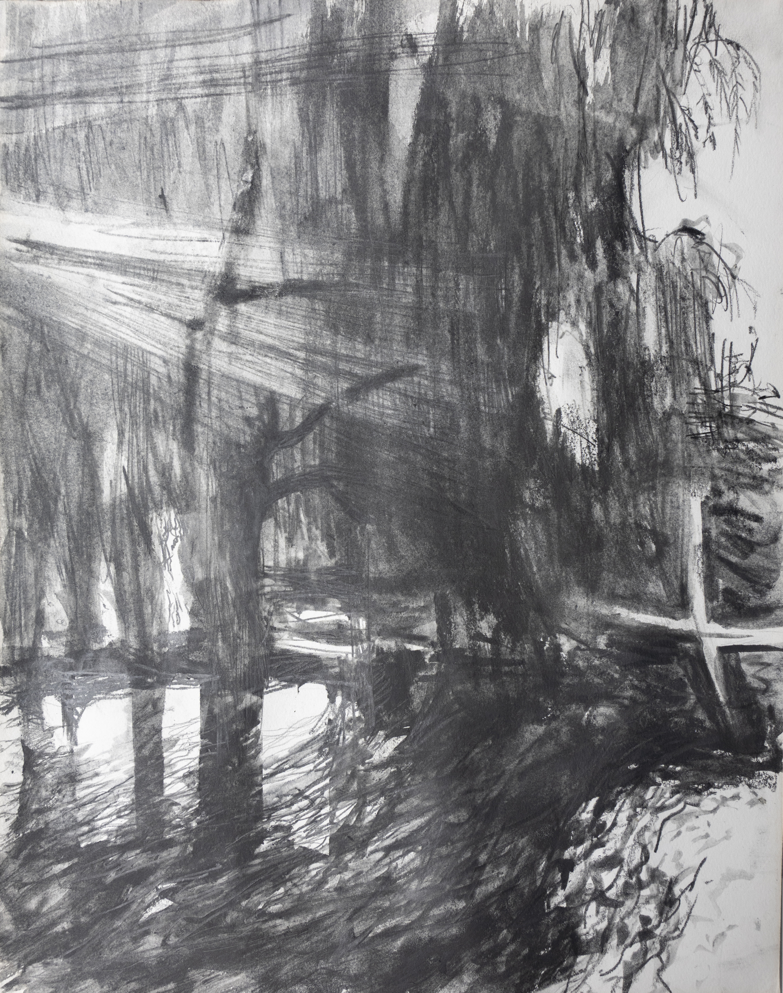 Landschap Bomen Water Licht Zon Natuur Tekening Potlood Grafiet Zwartwit