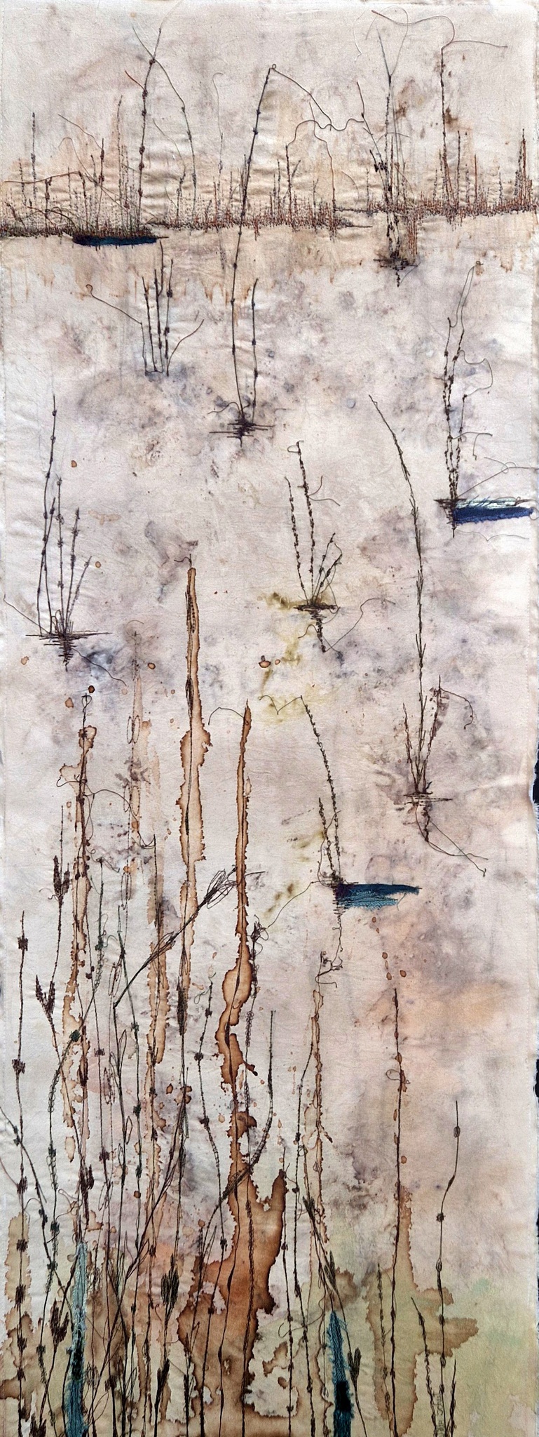 Machinaal borduurwerk op een door middel van eco-dying en verf bewerkte ondergrond lap.