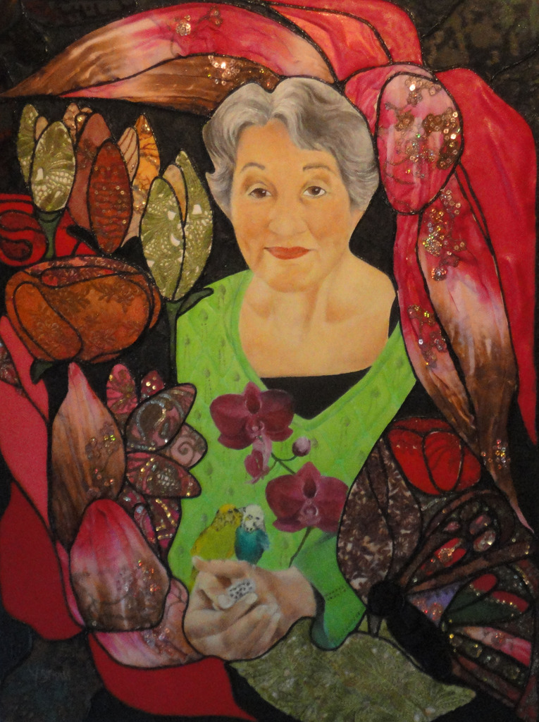 Inge Een geweldige vrouw die onbewust 31 jaar geleden een grote rol is gaan spelen in mijn leven, toen zei tijdens een reis naar Parijs mij in haar groep heeft opgenomen omdat ik alleen aan het reizen was. Nu 31 jaar later heb ik nog steeds een hele hechte vriendschapsband met haar zoon André en zijn gezin. Ik heb dit schilderij geschilderd als herinnering aan Inge die van ons heen is gegaan op 06-02-2013 voor André Annemiek Jason en Riley. In het schilderij zijn de stoffen verwerkt van haar kleding. De orchideeën, parkietjes en de kleurenpracht staan symbool voor Inge. Painted with love Yvonne