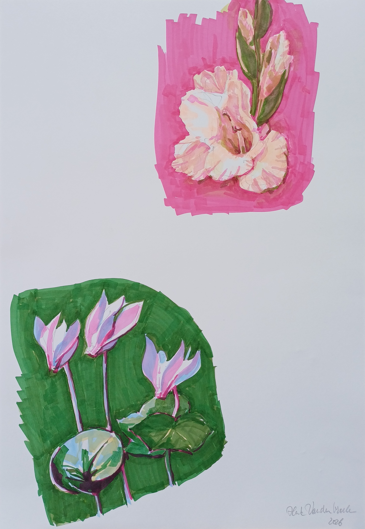 Kleine charmante werken op paneeltjes vaak A4-formaat. Portretten, bloemen, stillevens van fruit, glaasjes, doorkijken in het bos, een zicht met wachtende figuren….