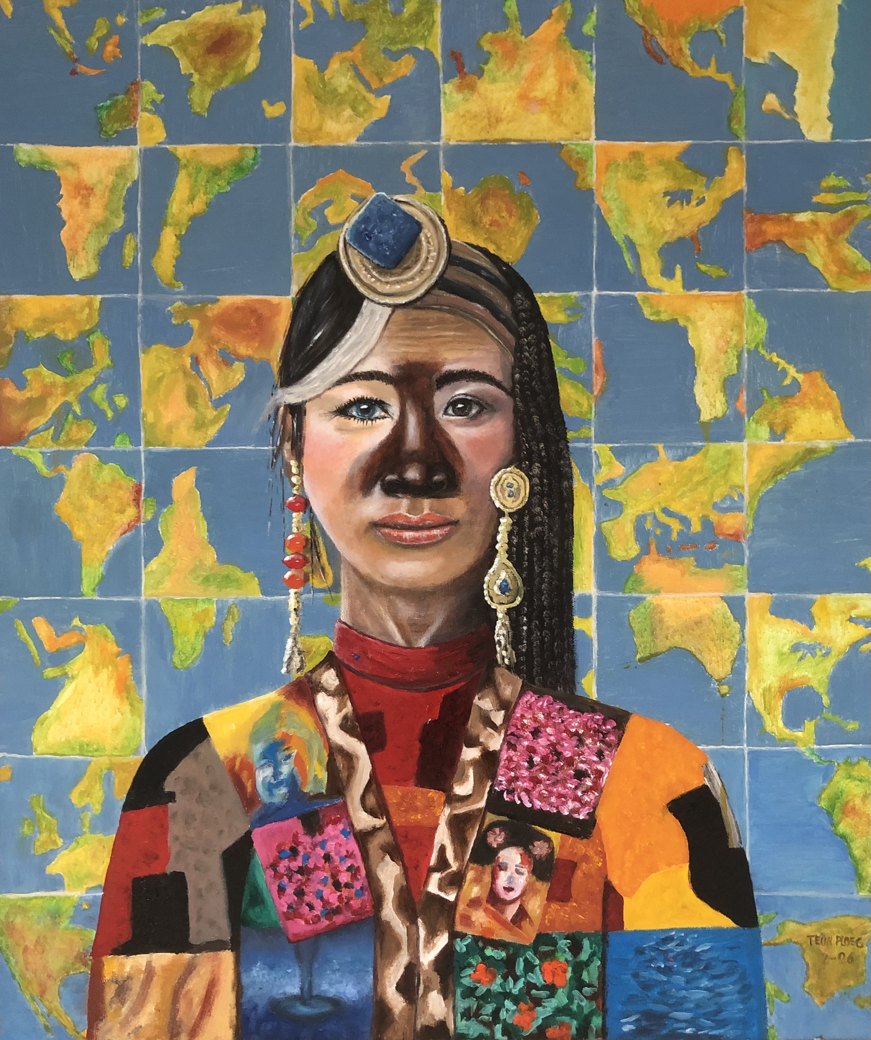 Between light and shadow. Between continents. Between stories. This portrait reflects how identity is not singular — it is woven from history, movement, memory, and culture. The world map behind her reminds us that we are shaped by more than one place. We are threads in a much larger tapestry.