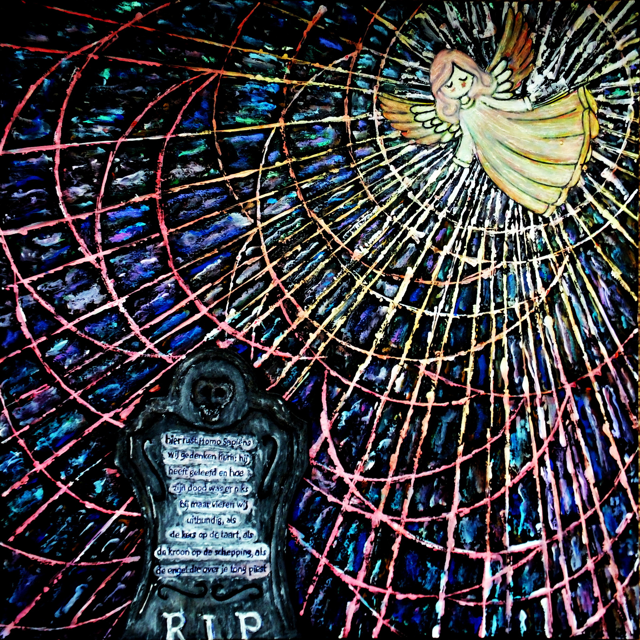 hier rust Homo Sapiëns. Wij gedenken hem: hij heeft geleefd en hoe … zijn dood was er niks bij maar vieren wij uitbundig: als de kers op de taart, als de kroon op de schepping, als de engel die over je tong piest. (hij was de praatjesmaker van het universum op https://www.antropoceen-reflecties.nl/ )
