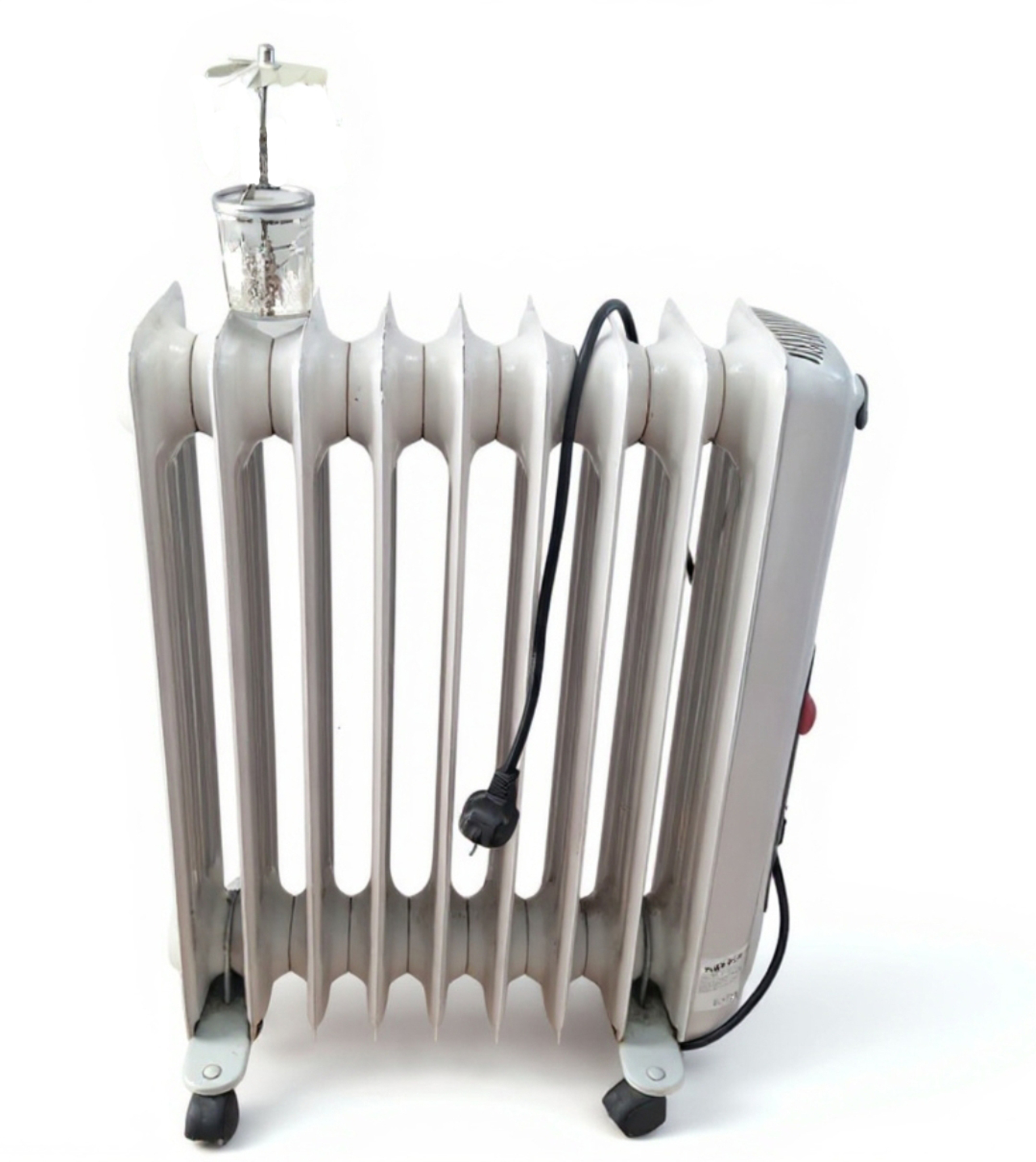 In absentia features a small electric oil radiator alone in a gallery. A lightweight metal convection wheel rests atop it; all decorative elements are removed, leaving only the bare rotating structure. The radiator is linked to an invisible motion sensor: when a visitor enters, it activates briefly. Heat accumulates slowly due to the oil’s thermal inertia, and the wheel often begins to turn only after the triggering visitor has left. Later visitors may see the wheel in motion without witnessing its cause. The installation creates a temporal gap between action and effect, presence and consequence. Human passage becomes an unseen trigger, with effects persisting independently of their origin. Operating without direct interaction or visible feedback, movement arises from residual heat rather than immediate response, allowing visitors to unknowingly activate experiences for others. In absentia investigates deferred causality, anonymous agency, and the persistence of effects beyond individual presence.