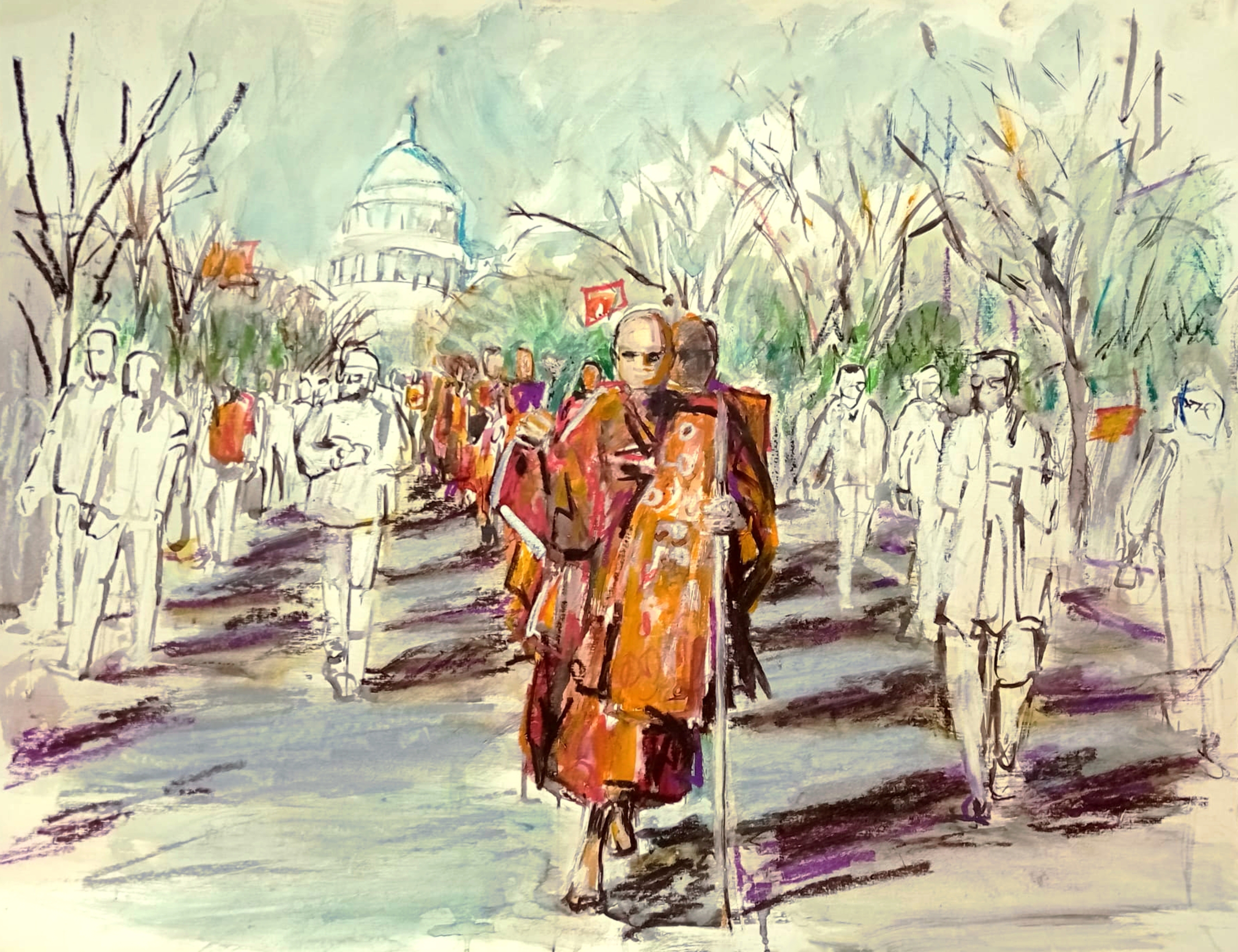 Via Facebook was Walk for peace van 24 boedistische monniken te volgen. ze liepen van Texas tot Washington. geen rellen,m geen agressie, overal werden ze met liefde en respect ontvangen. op grond van diverse facebook foto's dit beeld gemaakt