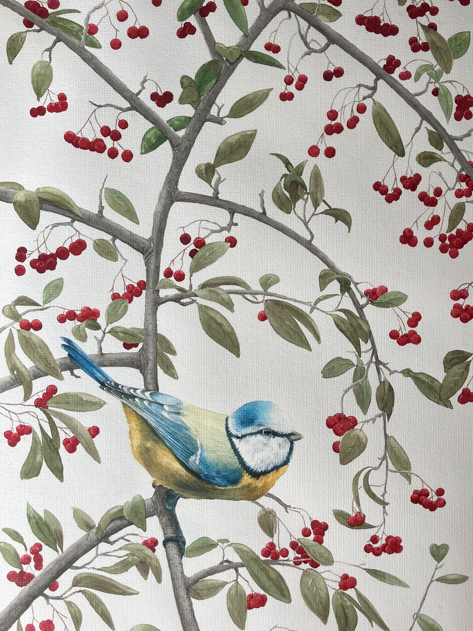 Een pimpelmees in een dwergmispel zit op de uitkijk.