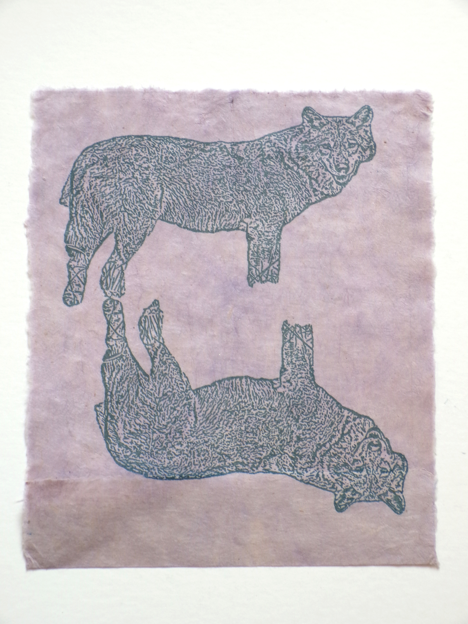 Experiment op dun papier. Het is een test waarin ik meerdere figuren, in dit geval een wolf, laat terugkeren op verschillende ondergronden. Bv. op de voorkant van een boek, op een gedrukte kaart, een papieren zakje.....