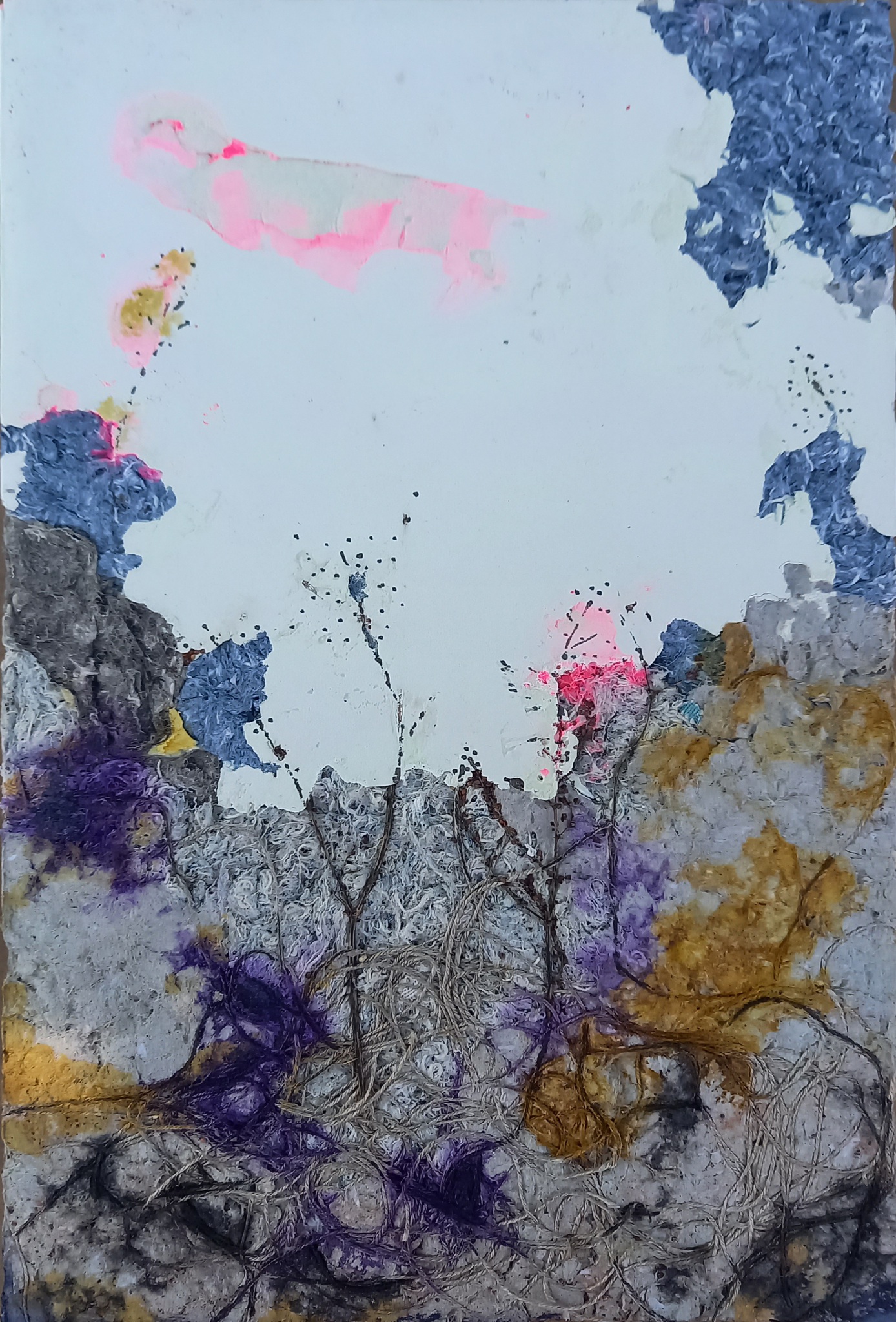 Ik maak in mijn werken gebruik van papier en olieverf. Sommigen noemen het collages, ik noem het liever collageschilderijen.