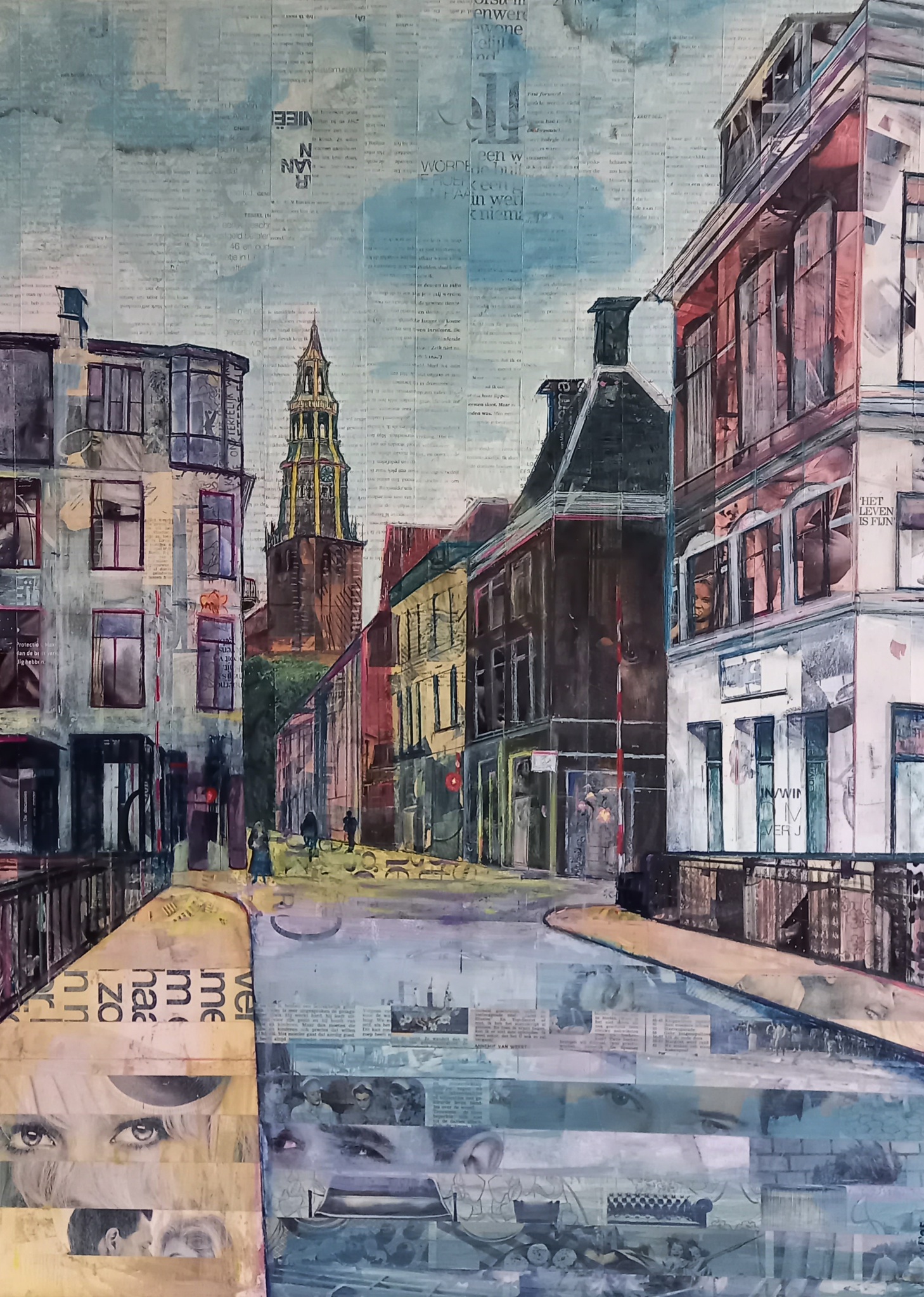 Papier Olieverf Collageschilderij Mixedmedia Groningen Stadgezicht