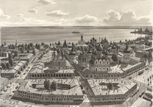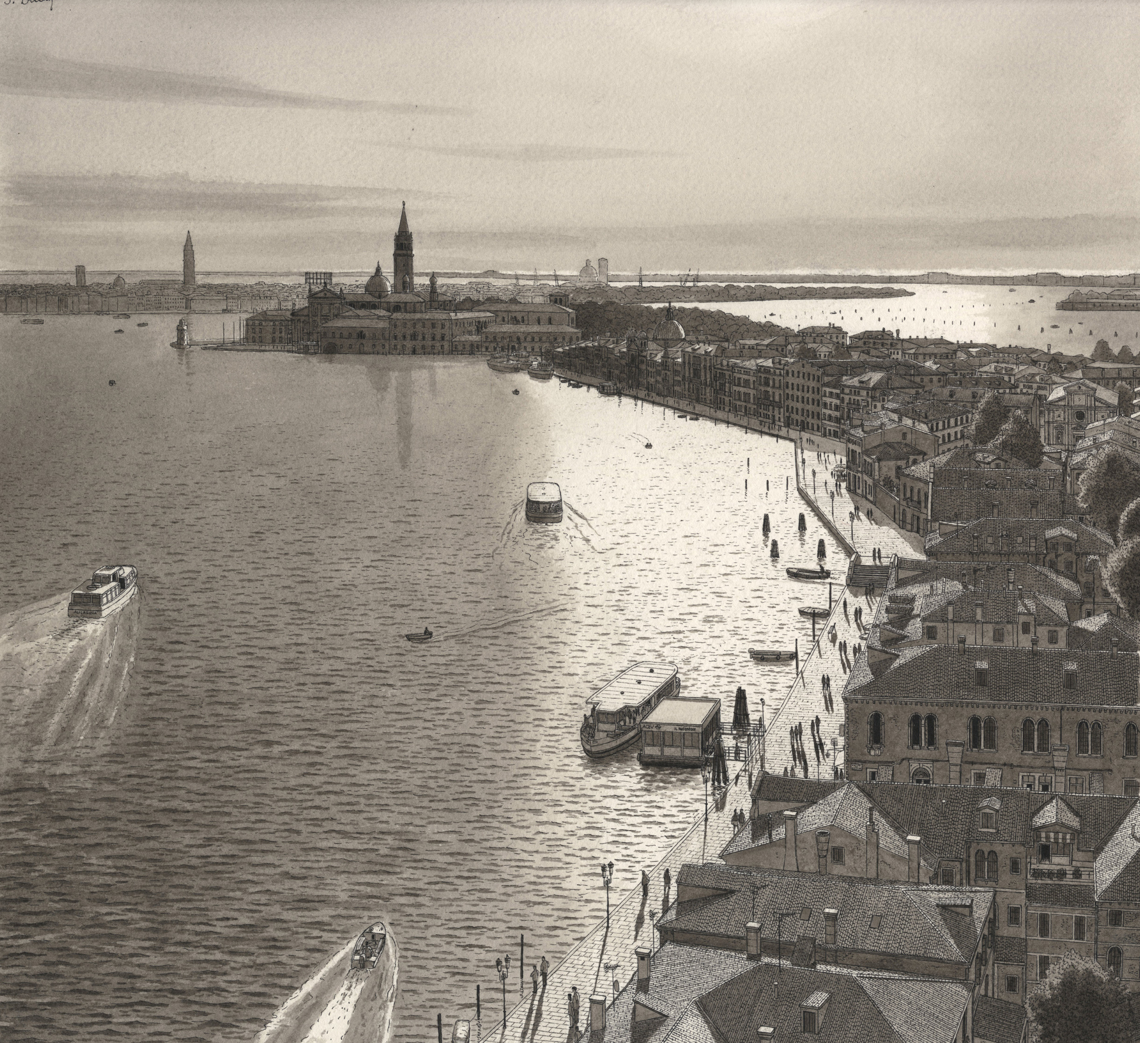 In deze tekening kijken we uit over het eiland Giudecca in Venetië naar de opkomende zon. In de verte verrijst de sierlijke klokkentoren van San Giorgio Maggiore en links daar achter is nog een stukje van het hoofdeiland van Venetië te zien.