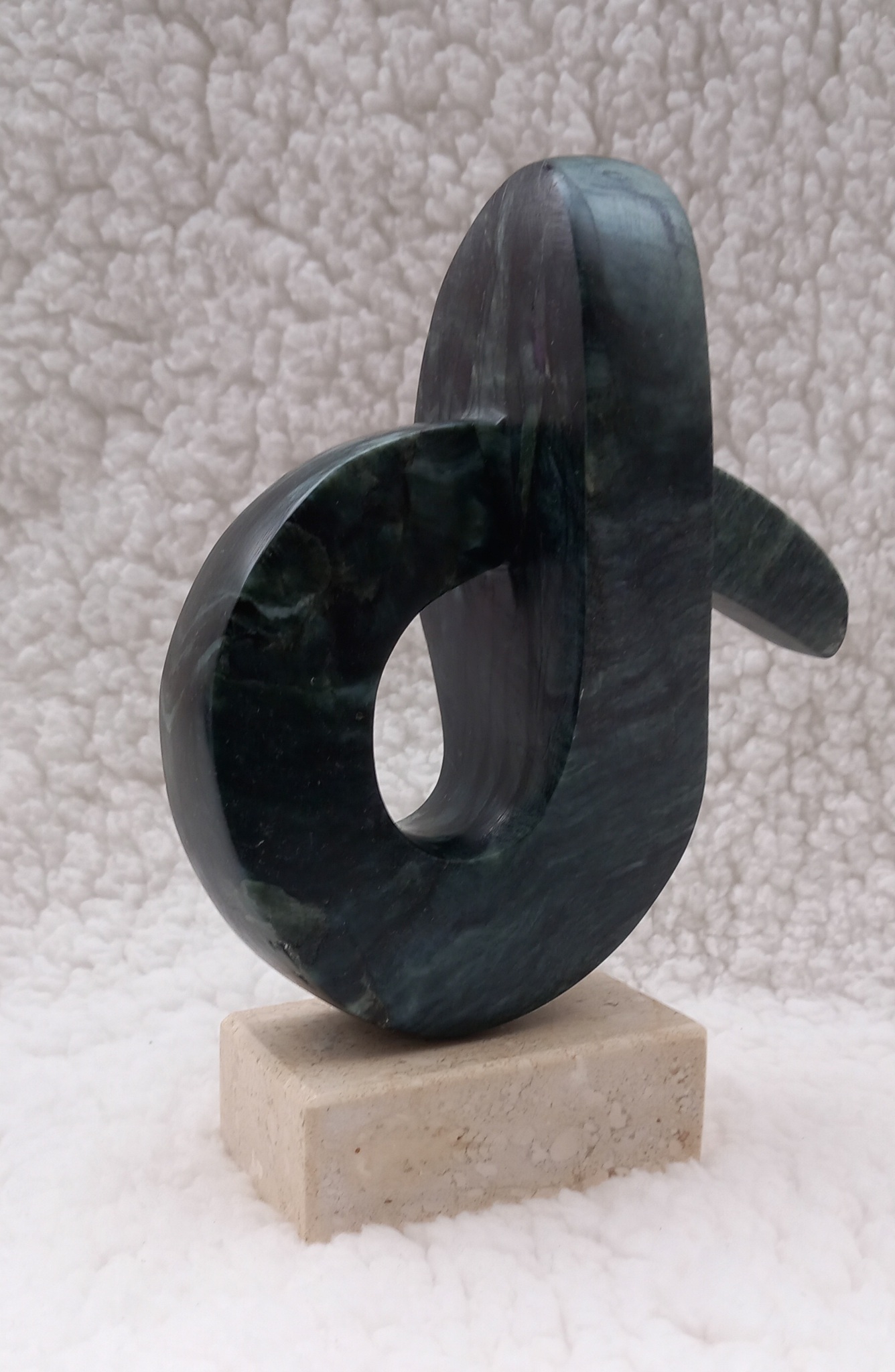 een mooie zwart/grijze krul gemaakt naar een ander beeldje van mij, de Eekhoorn, dat gesneuveld is. De Eekhoorn is ook in deze groep te vinden.