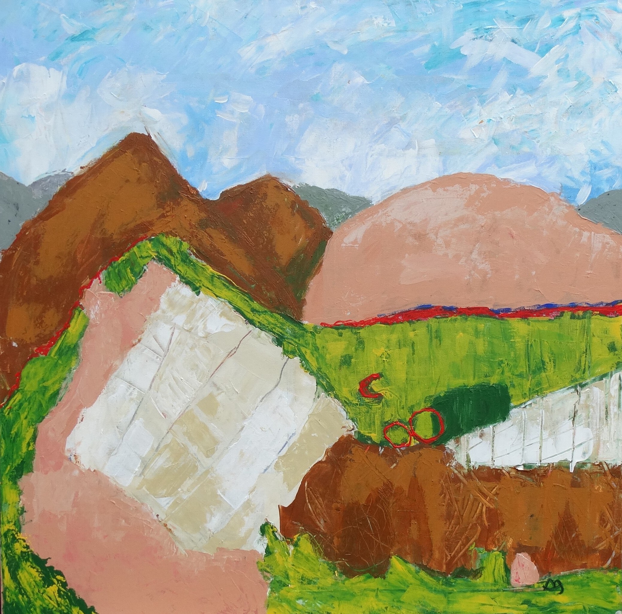 Er lijkt een fiets verstopt te zitten in dit tafreel. Die is er per ongeluk in gekomen. Dat is niet erg, dat mag er zijn. Vlakverdeling waarbij ik de bergen nog een rol laat spelen.