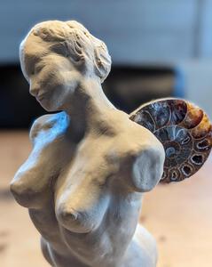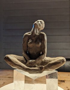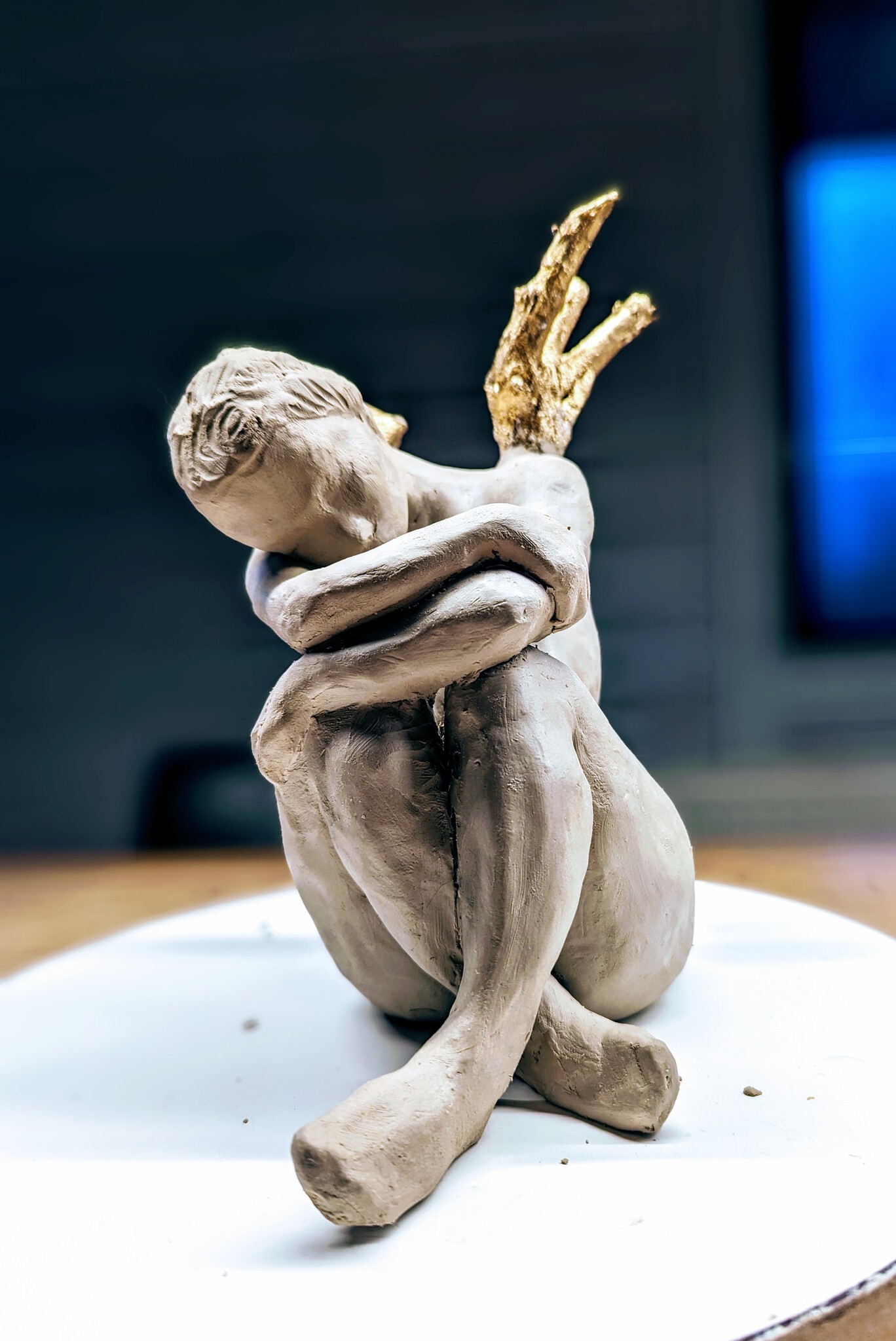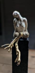 Zittende vrouw in klei met "vleugels" van hout