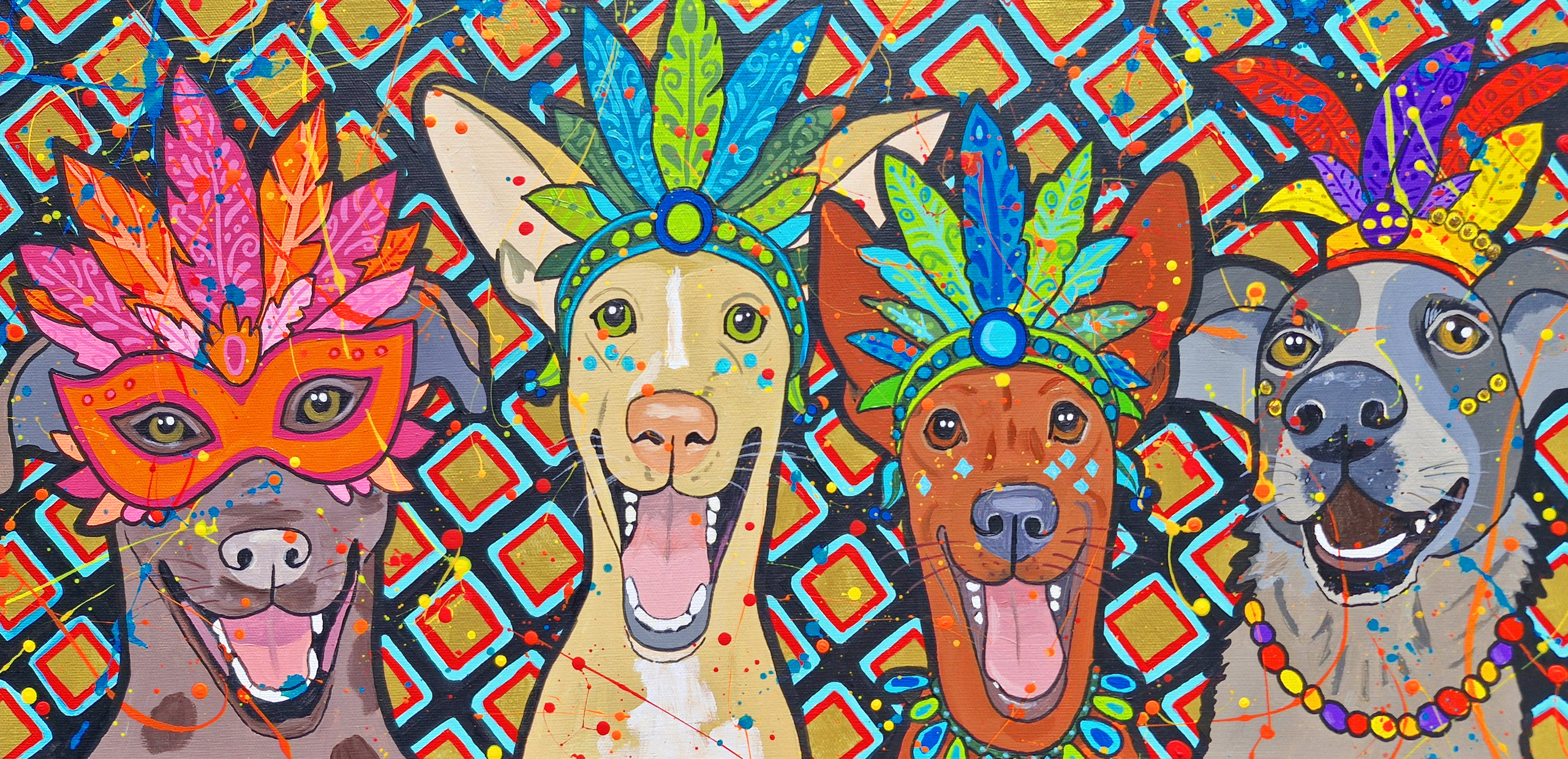 In dit levendige schilderij vieren de podencos, de charmante honden van Spanje, carnaval in Aguilas. Omringd door veel kleur vieren zij uitbundig fiesta, ze stralen vrijheid en vreugde uit,