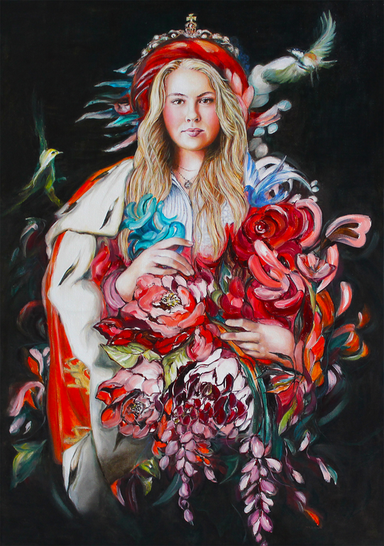 Een tuin van kleur, een blik vol verbeelding. Haar werk ademt een poetische zachtheid, maar ook lef: ze experimenteert graag met bladgoud, olieverf en gemengde technieken.