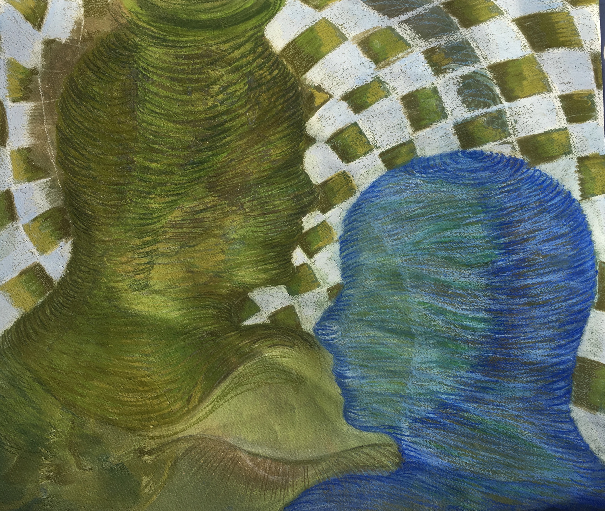 Twee figuren ontmoeten elkaar , de figuren hebben een organische structuur en zijn opgebouwd in gemengde techniek.