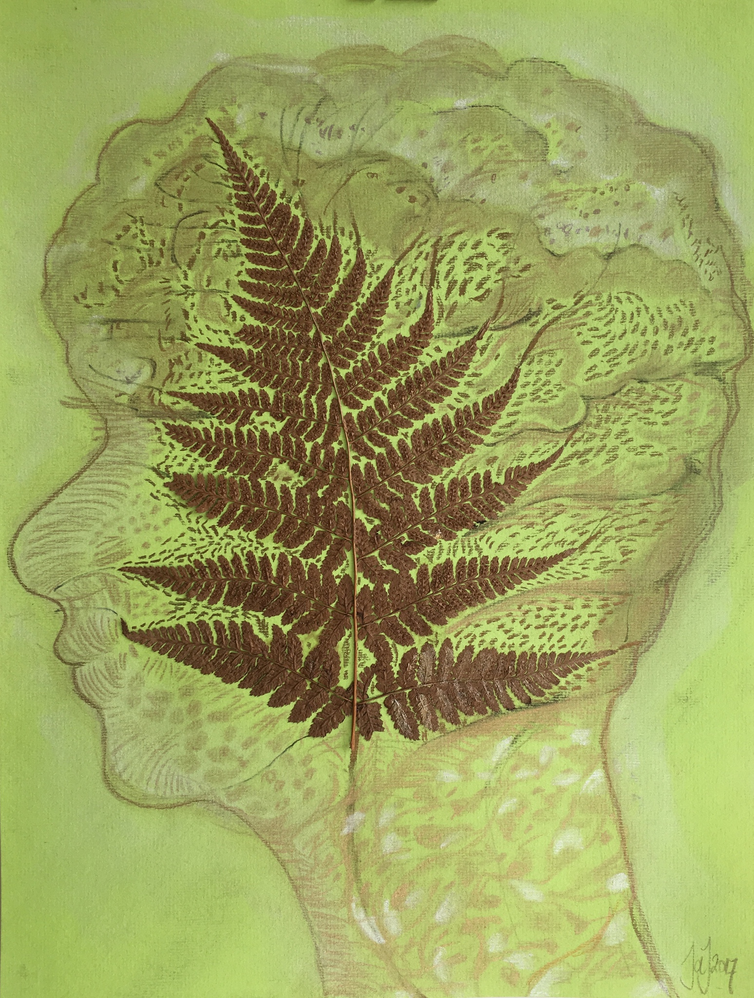 Profiel in pastel op gekleurd papier met gedroogd varen blad