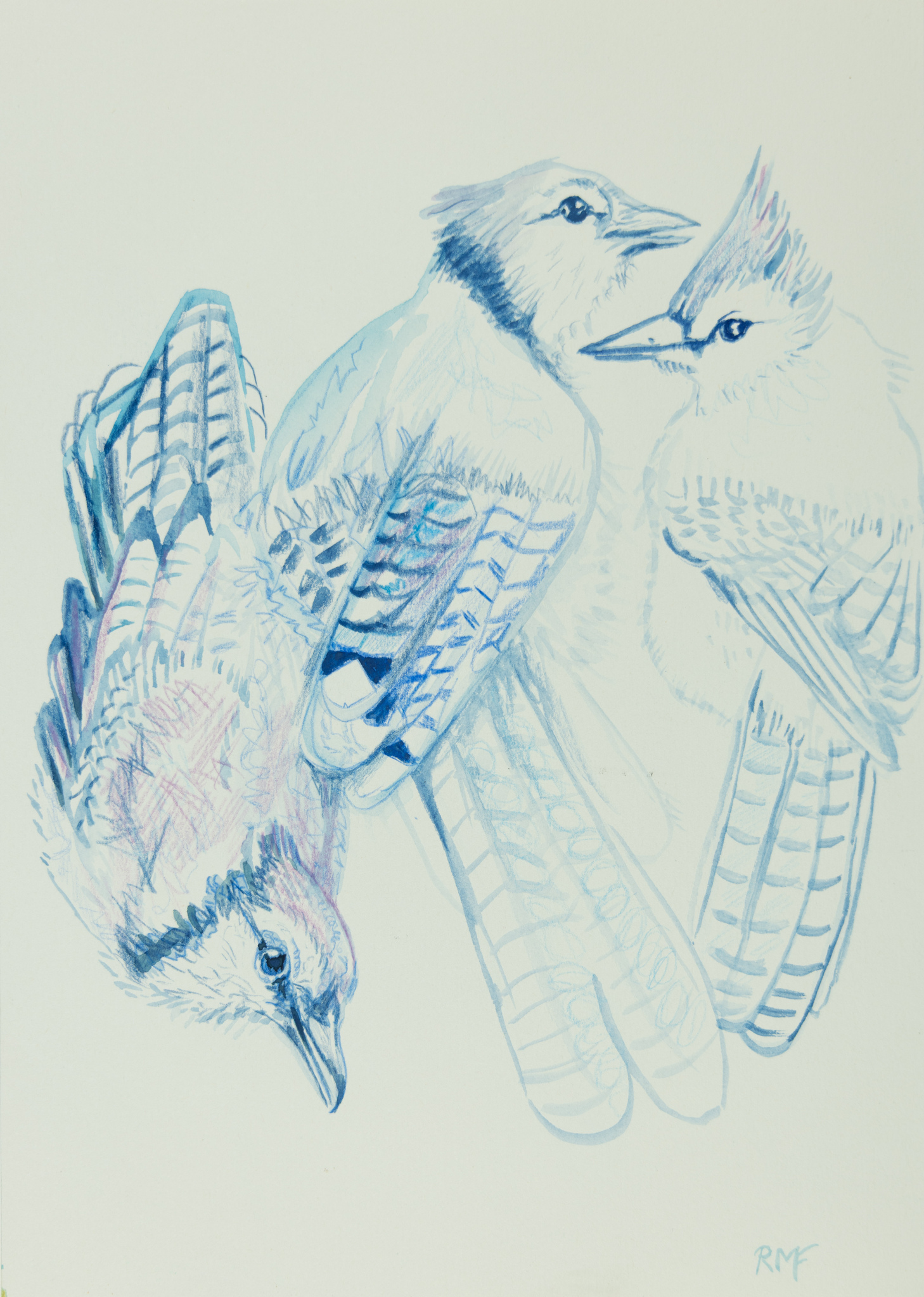 Bluejay party. Hoge kwaliteit kunstprint op A3 of A4 of A5 fotopapier van dit werk, origineel is niet beschikbaar vanwege het beschilderen van voorkant en achterkant in een schetsboek.