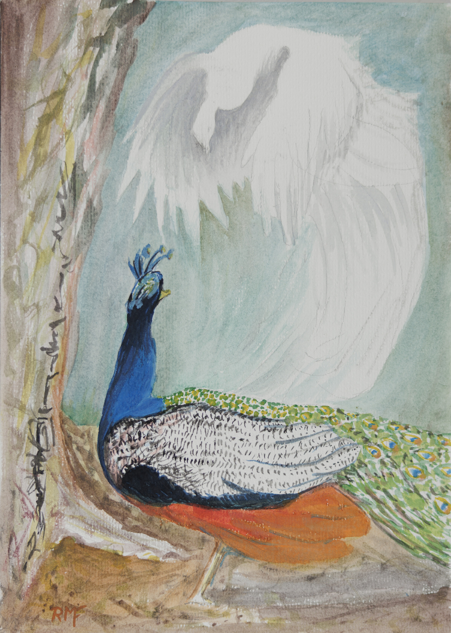 Vliegende ziel van een pauw Hoge kwaliteit kunstprint op A3 of A4 of A5 fotopapier van dit werk, origineel is niet beschikbaar vanwege het beschilderen van voorkant en achterkant in een schetsboek.