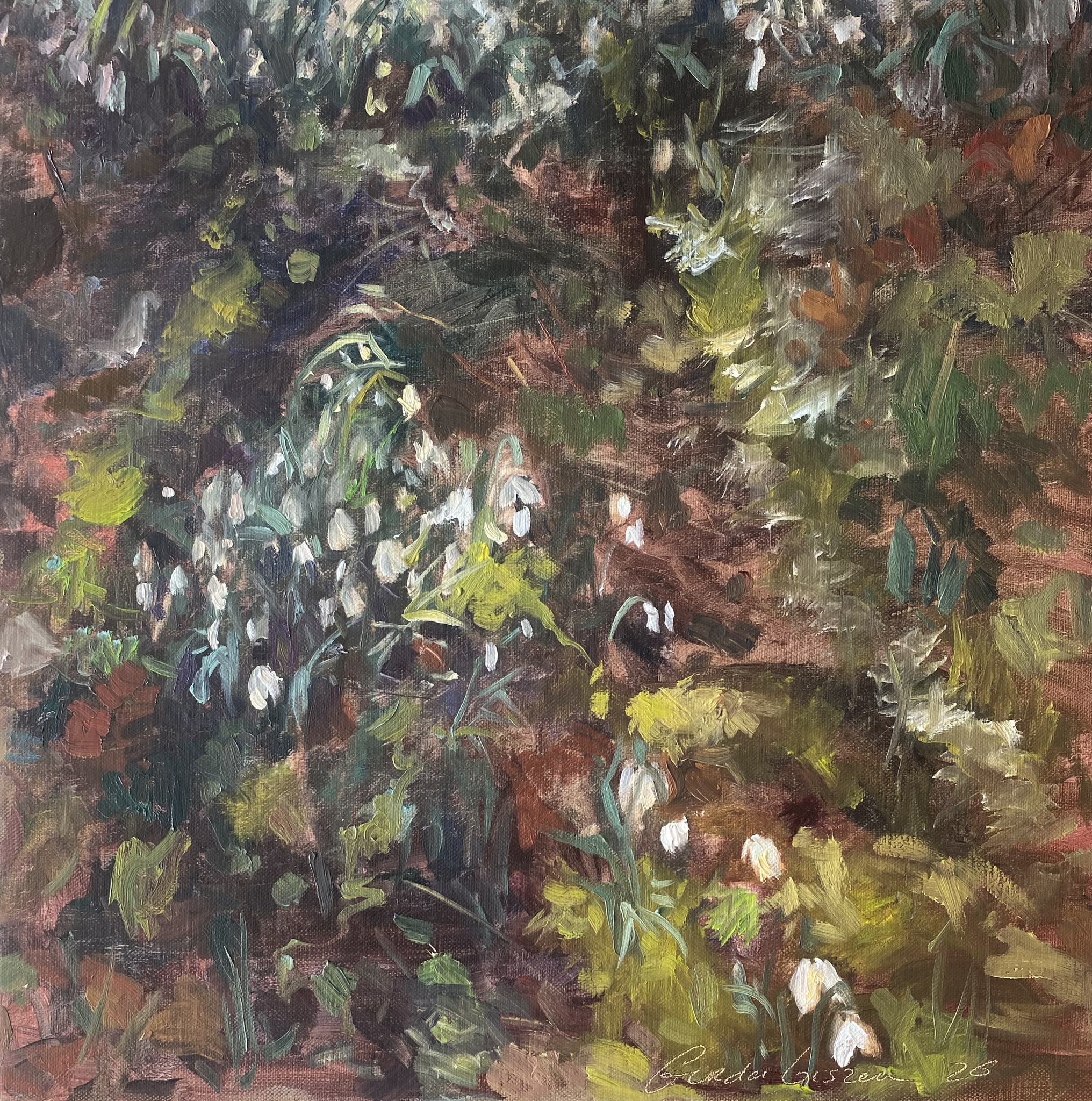 Sneeuwklokjes in de tuin, 2026 40 x 40 cm | olieverf op doek