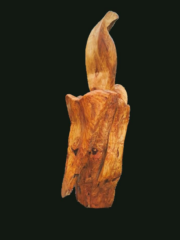 Een hoeve in Mortsel die nog uit de middeleeuwen stamt. Een sympathieke groep vrijwilligers hebben er een mooie tuin van gemaakt met inheemse en vaak zeldzame planten. Het is eveneens een troostplek geworden, een ontmoetingsplaats met mooie gedichten erbij. Er stond ook een mooie kerselaar die helaas niet het eeuwige leven had. Ik heb er een beeld van mogen maken dat er nu nog staat. De boeiende vorm van die grote stam leverde verschillende figuren op die je er in kunt zien. Aan de kijker om een eigen interpretatie te geven en het beeld te laten leven, en als het even kan zelf een naam te geven. Ook om te denken aan de persoon die hem zo dierbaar is