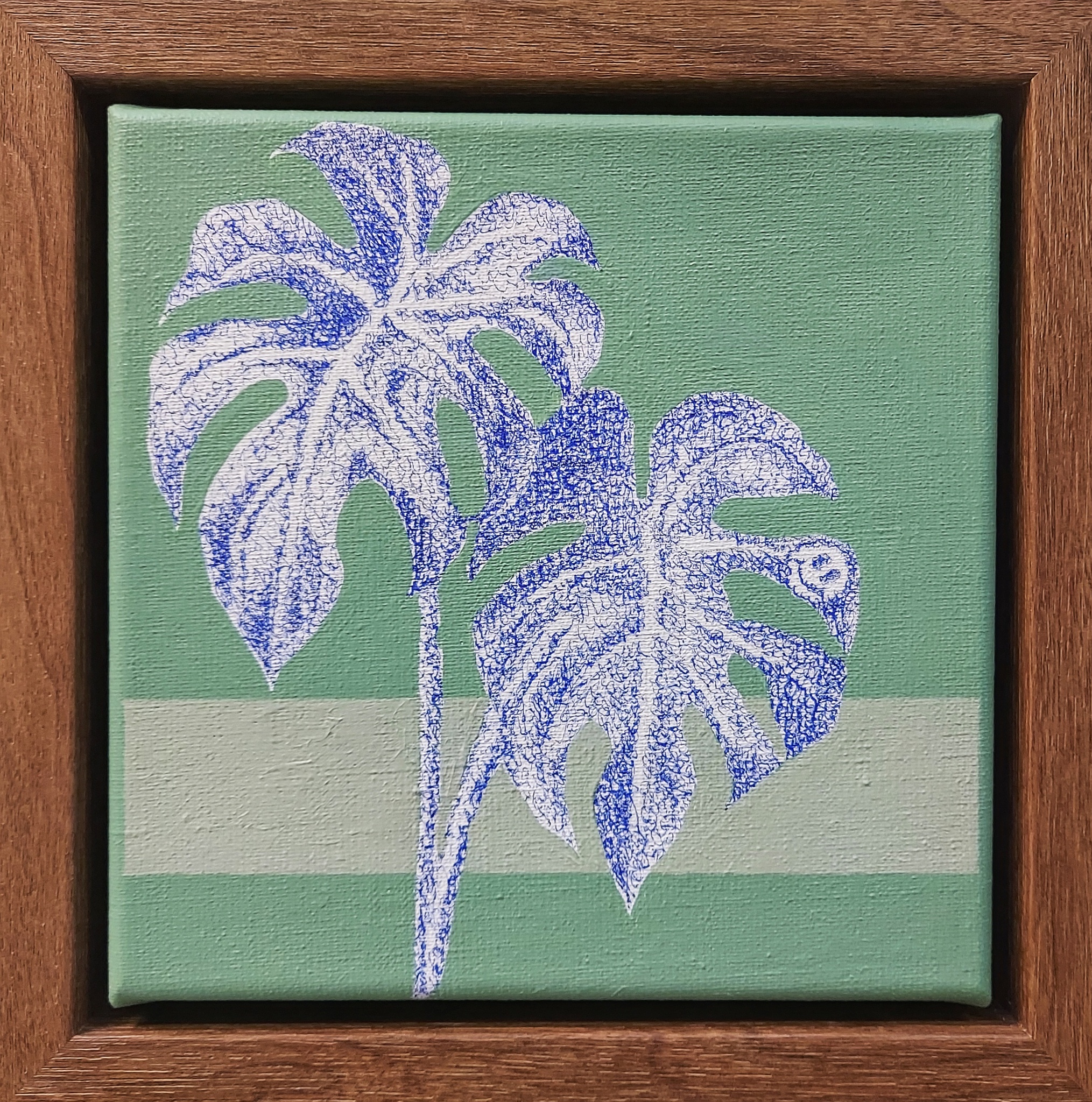 Monstera, Mijmeringen, geschreven met blauwe BIC pennen op linnen. Gedachtes over momenten, items, verhalen, van toen, nu en in de toekomst. Een songtekst, een boodschappenlijstje, leuke woorden etc. Ingelijst in luxe houten lijst, kleur Walnut