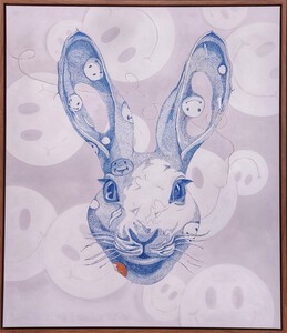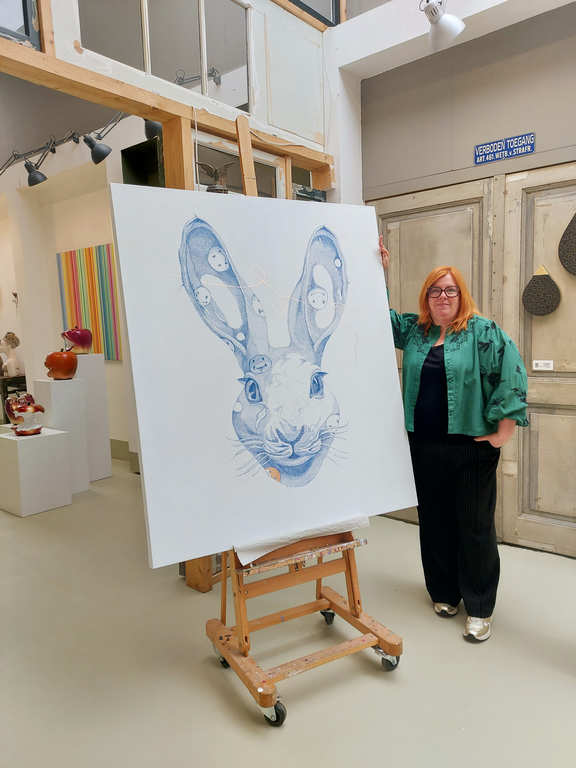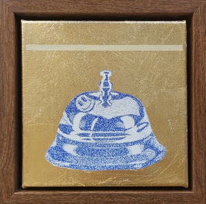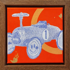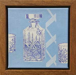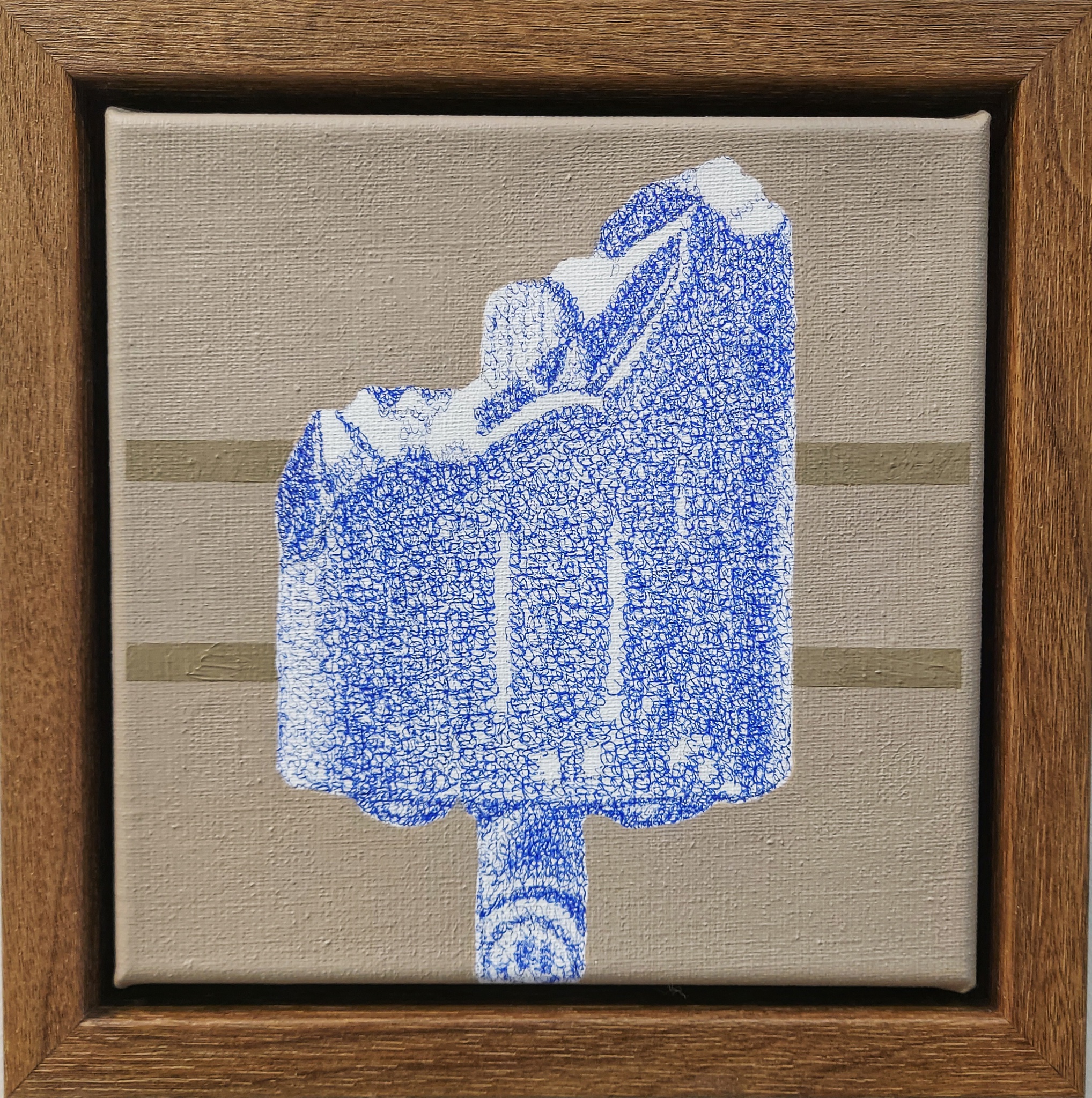 Ijsco, Mijmeringen, geschreven met blauwe BIC pennen op linnen. Gedachtes over momenten, items, verhalen, van toen, nu en in de toekomst. Een songtekst, een boodschappenlijstje, leuke woorden etc. Ingelijst met luxe houten lijst, kleur walnut. Incl lijst 25x25 cm. Excl lijst 20x20 cm.