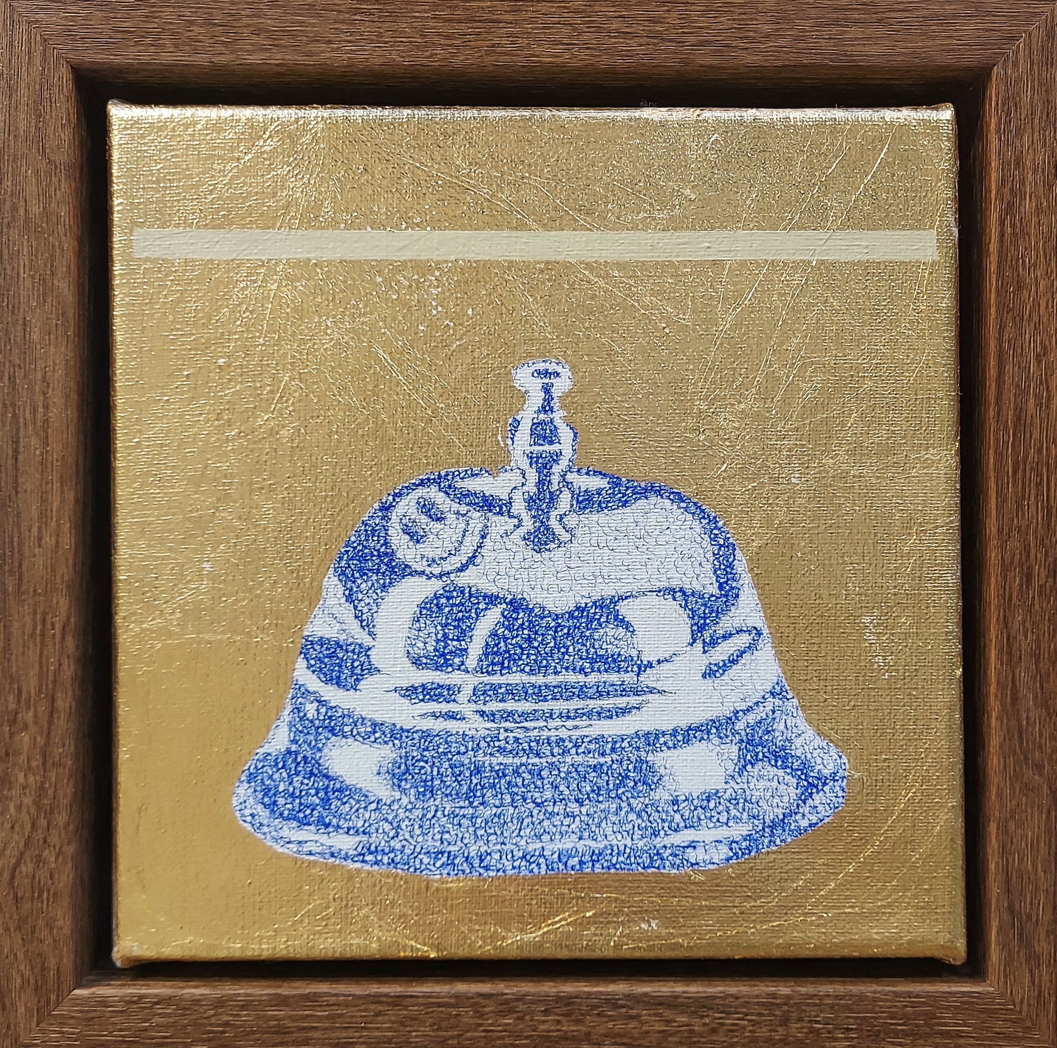 Balie-bel, Mijmeringen, geschreven met blauwe BIC pennen op linnen. Gedachtes over momenten, items, verhalen, van toen, nu en in de toekomst. Een songtekst, een boodschappenlijstje, leuke woorden etc. Ingelijst met luxe houten lijst, kleur walnut. Incl lijst 25x25 cm. Excl lijst 20x20 cm.