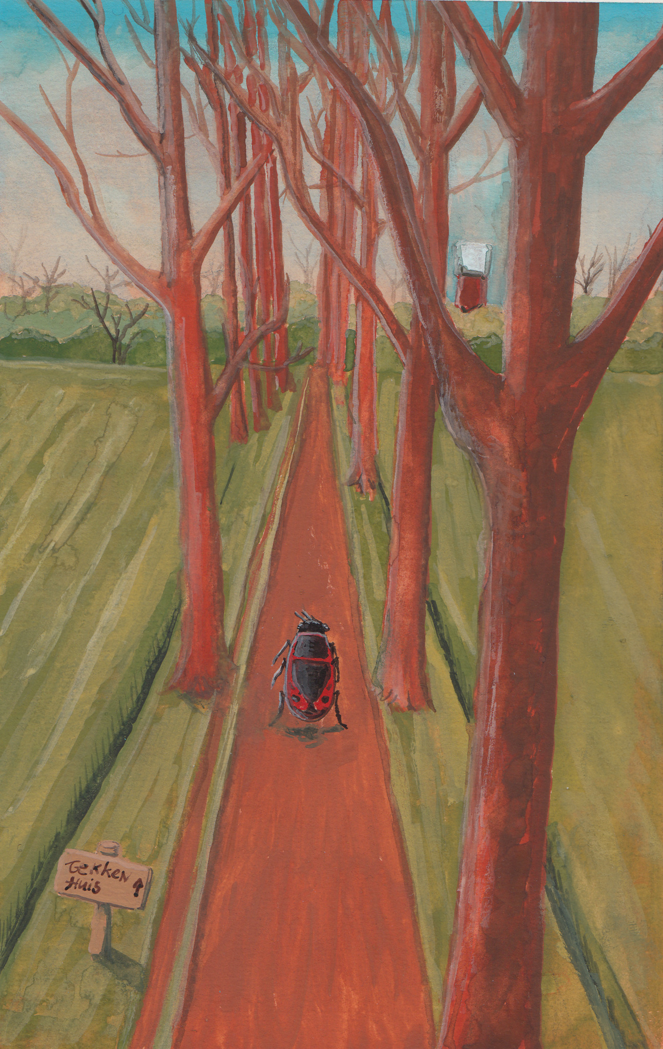 Ik heb me laten vertellen dat Ruach alleen was. Het pad strekte zich voor hem uit, aan weerszijden torenden de bomen over hem. Een bleek zonlicht scheen tussen de takken door, en het blauw van de lucht reflecteerde vanaf zijn schild van chitine. De aarde bij zijn pootjes dampte, in de toenemende warmte onder de jonge voorjaarszon. Het gras aan weerszijden van het pad, aan de andere kant van de sloten, was een helder frisgroen. Vogels kwetterden, hun aanwezigheid slechts kenbaar makend, door hun geluid van hoog boven in de takken van de bomen. In de verte, aan het eind van het pad, werd een oude watertoren zichtbaar tussen de bomen en struiken van het park. Het park was hem vertrouwd, niet zijn woonplaats, maar ook niet ver er vandaan. Gouache op baohong hot pressed aquarelpapier