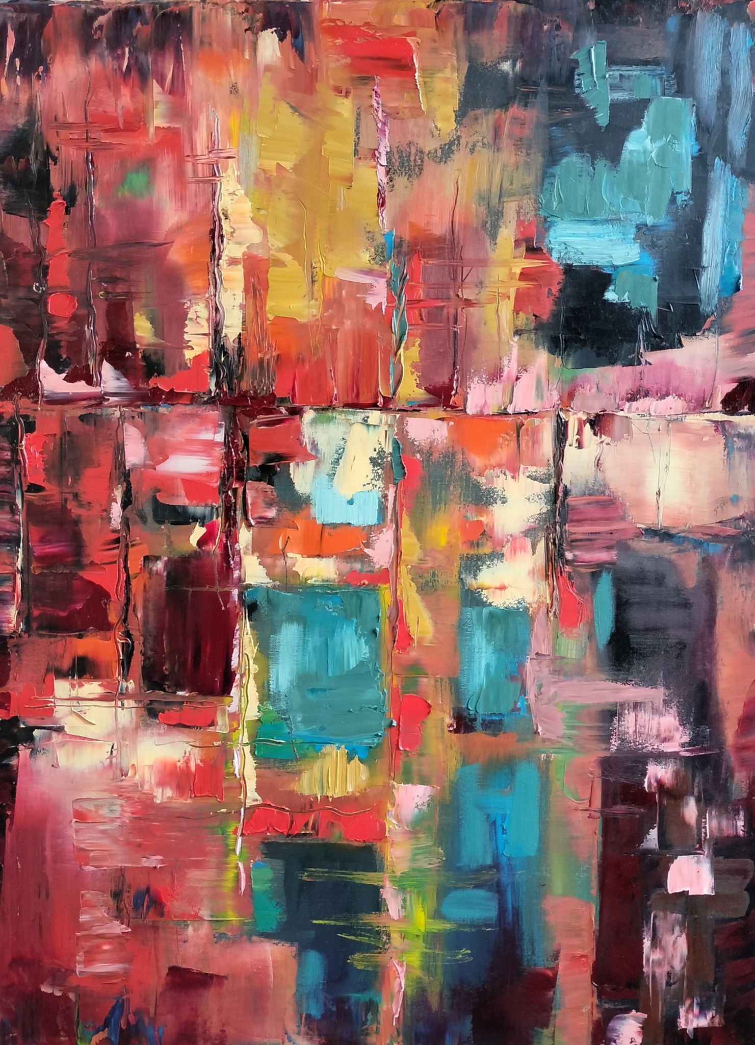 het rood symboliseert het bloed en het menselijke leed dat door conflicten is veroorzaakt . Tussen het rood verschijnen koele vlakken van blauw , turquoise en huidtinten ,die als breekbare lichtpunten door de duisternis heen schijnen - een verwijzing naar hoop , MENSELIJKHEID en het verlangen naar vrede .