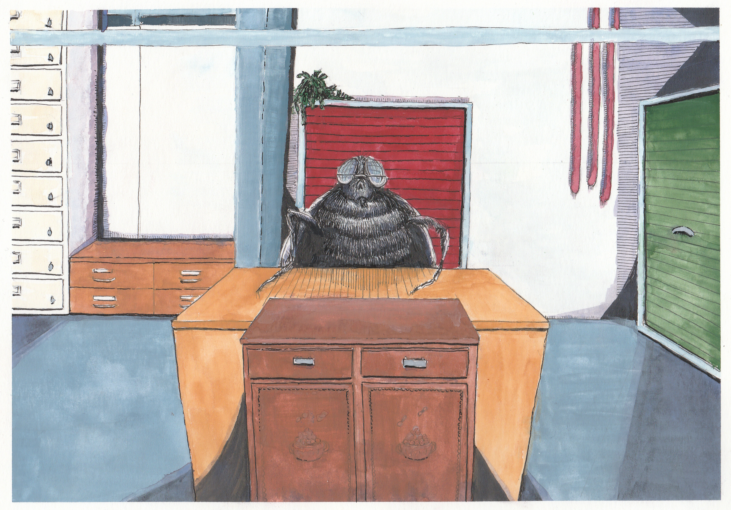Dit deel van het verhaal moet nog geschreven worden, al is alles in grote lijnen aanwezig. Wat ik er over kan vertellen is dat de bromvlieg in dit verhaal een onderdrukker is, zonder hart voor al het moois dat er ontstaat. Dit bureau staat in het wantsermuseum, en de bromvlieg is als een kritische toezichthouder aanwezig. Het luidt het begin van het einde van de creatieve vrijplaats in. Gouache op canson mixed media papier