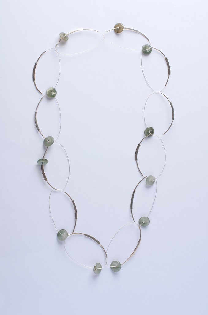 Jade ringetjes op schakels van staaldraad en zilver. Omdat de ringetjes los op de schakels zitten, verandert de vorm tijdens het dragen.
