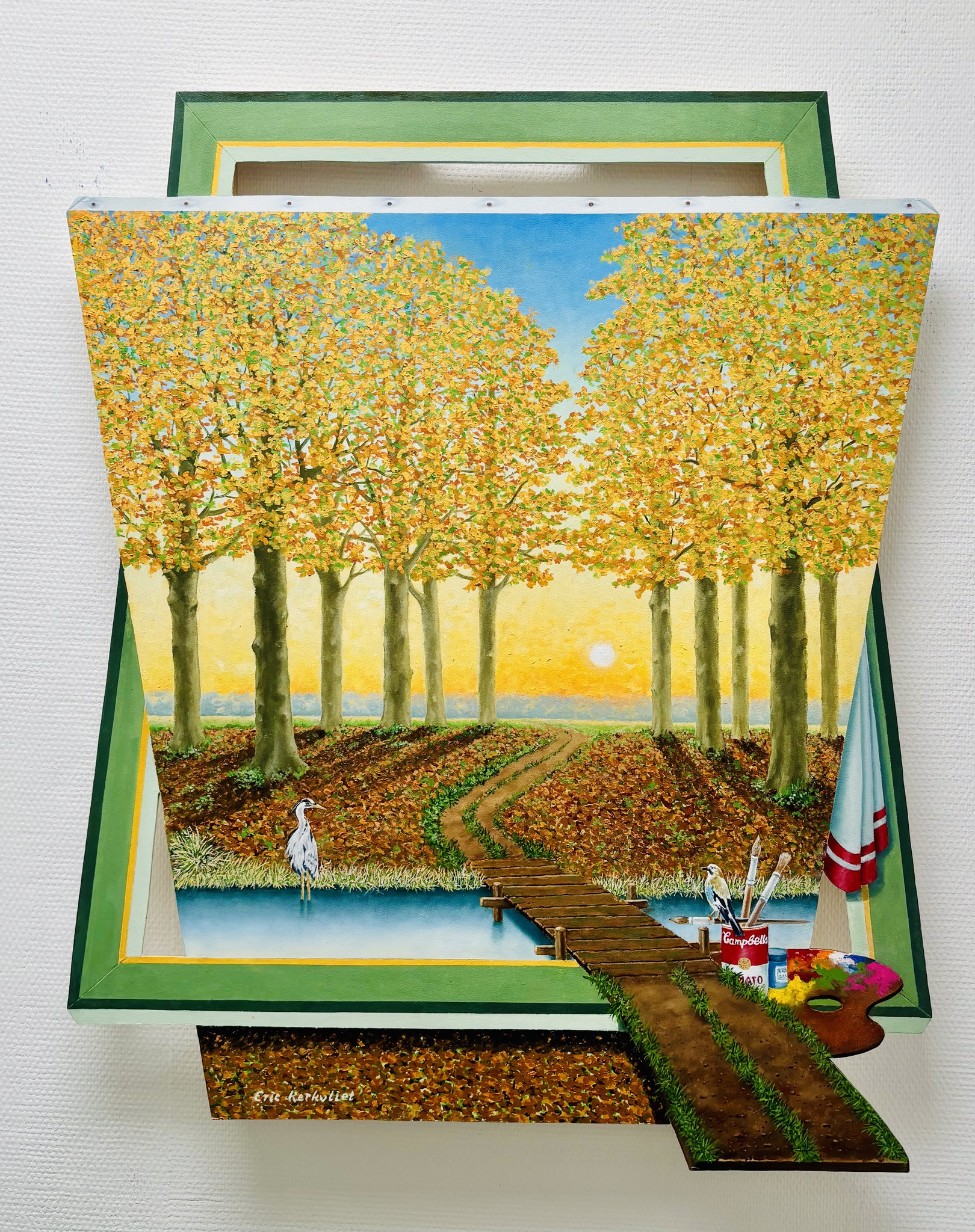 Eric Kerkvliet schildert met olieverf uiterst gedetailleerd voorstellingen op iets verhoogd paneel waardoor bij juiste belichting een Trompe-l’oeil-achtig effect ontstaat.