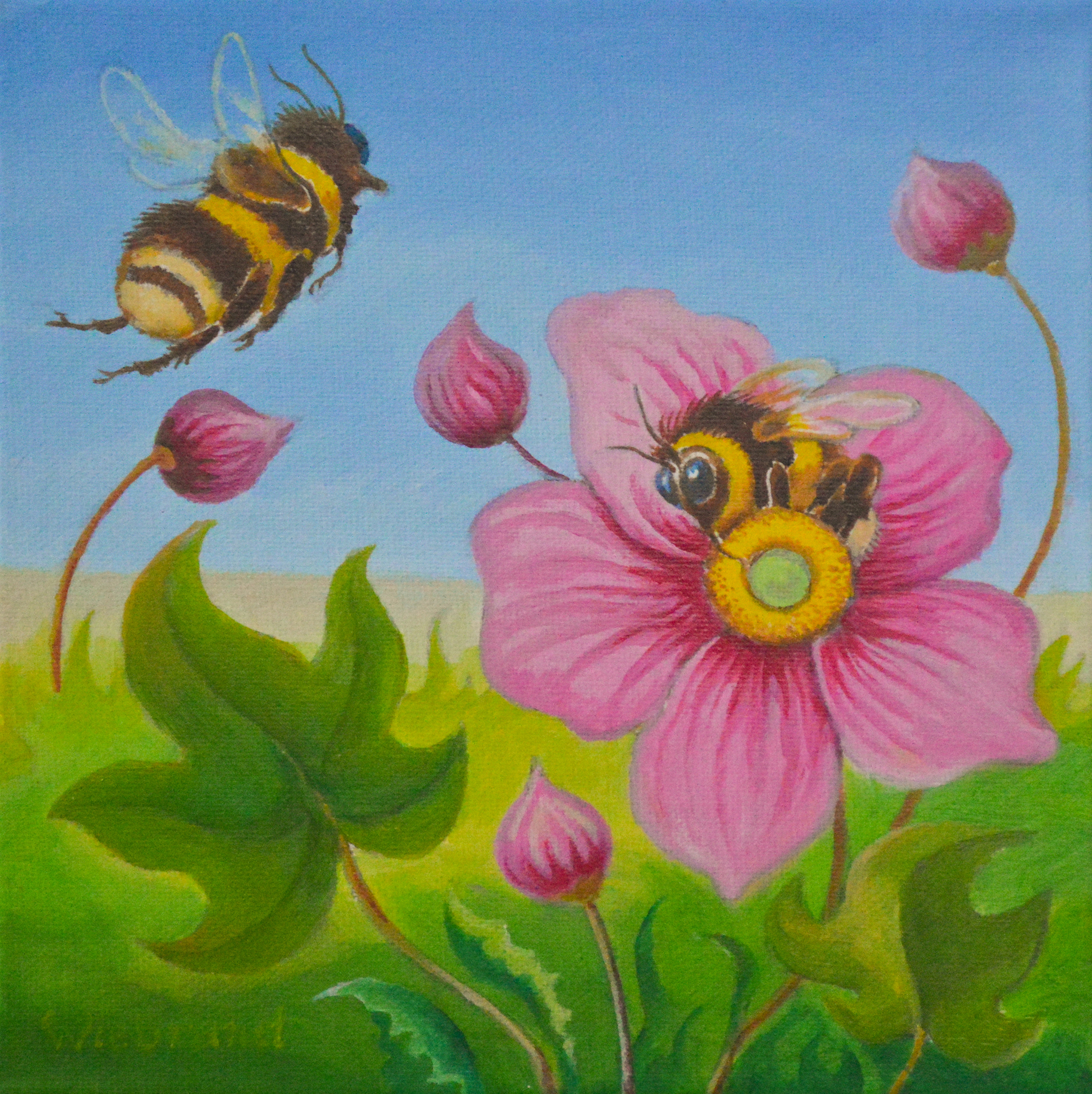 Bijen Hommels Bloemen Vrolijk Mini Schilderij Olieverf Zomer Natuur
