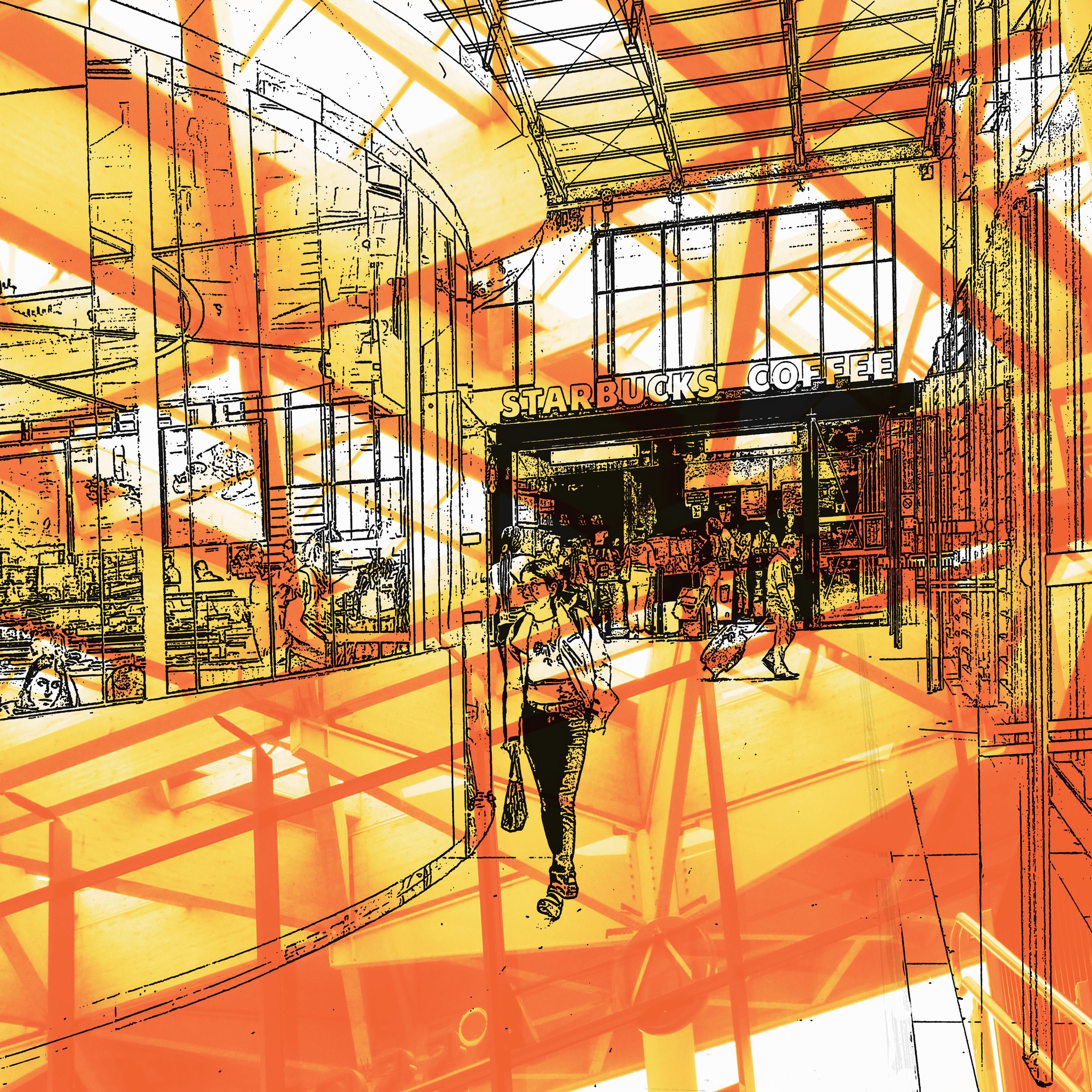 Koffie bij Gare du Nord, Parijs. Moderne architectuur * te koop digitale art print, 50 x 50 cm, prijs: € 365 (inclusief lijst, of op dibond) (diverse formaten zijn mogelijk, naar uw wens - de prijs variëert dan mee)