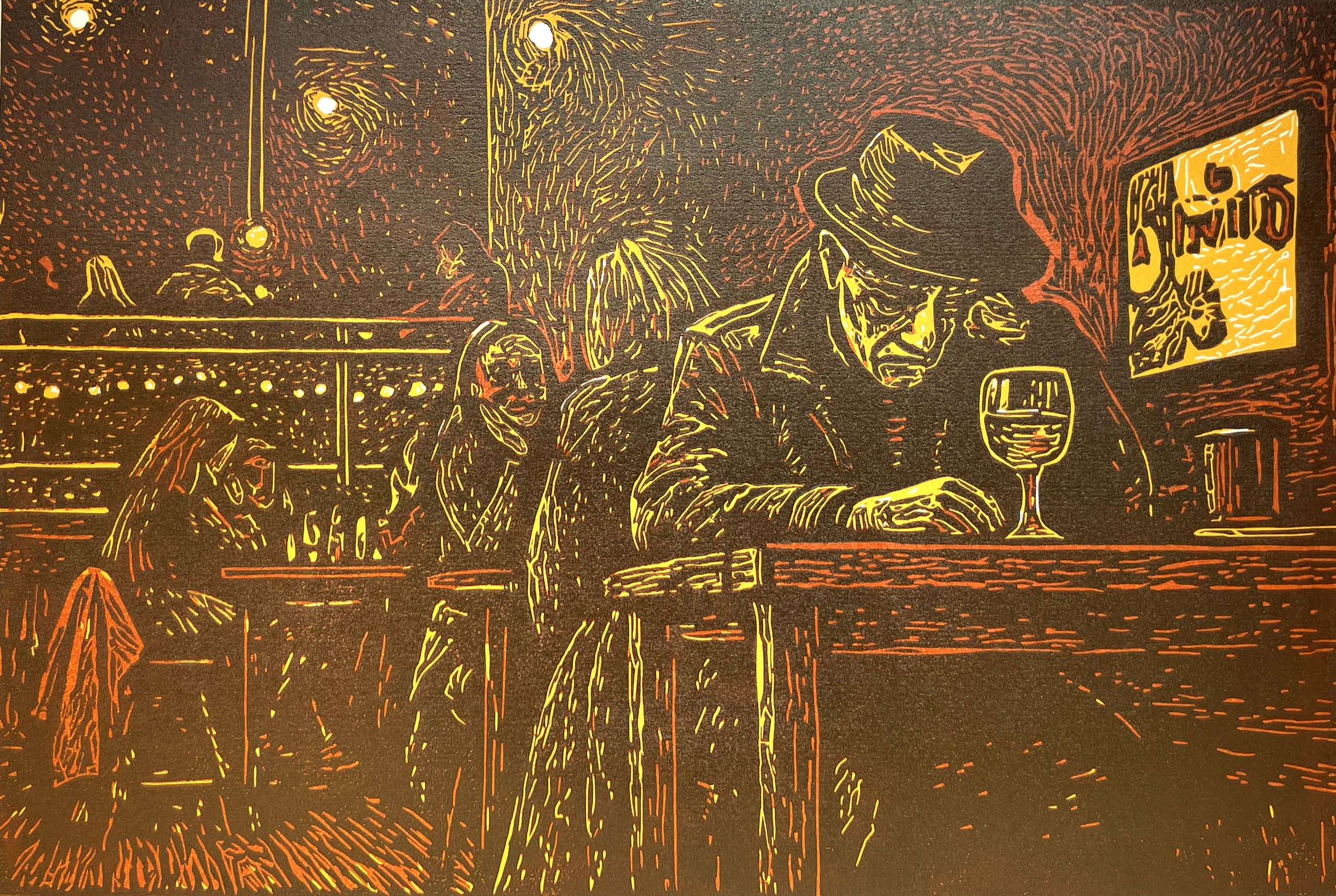 Linosnede, reductietechniek, 4 drukgangen. Beperkte oplage: 5 genummerde exemplaren. Materiaal: Fabriano Rosaspina 220 gr en Cranfield Caligo Safewash Relief Inks.