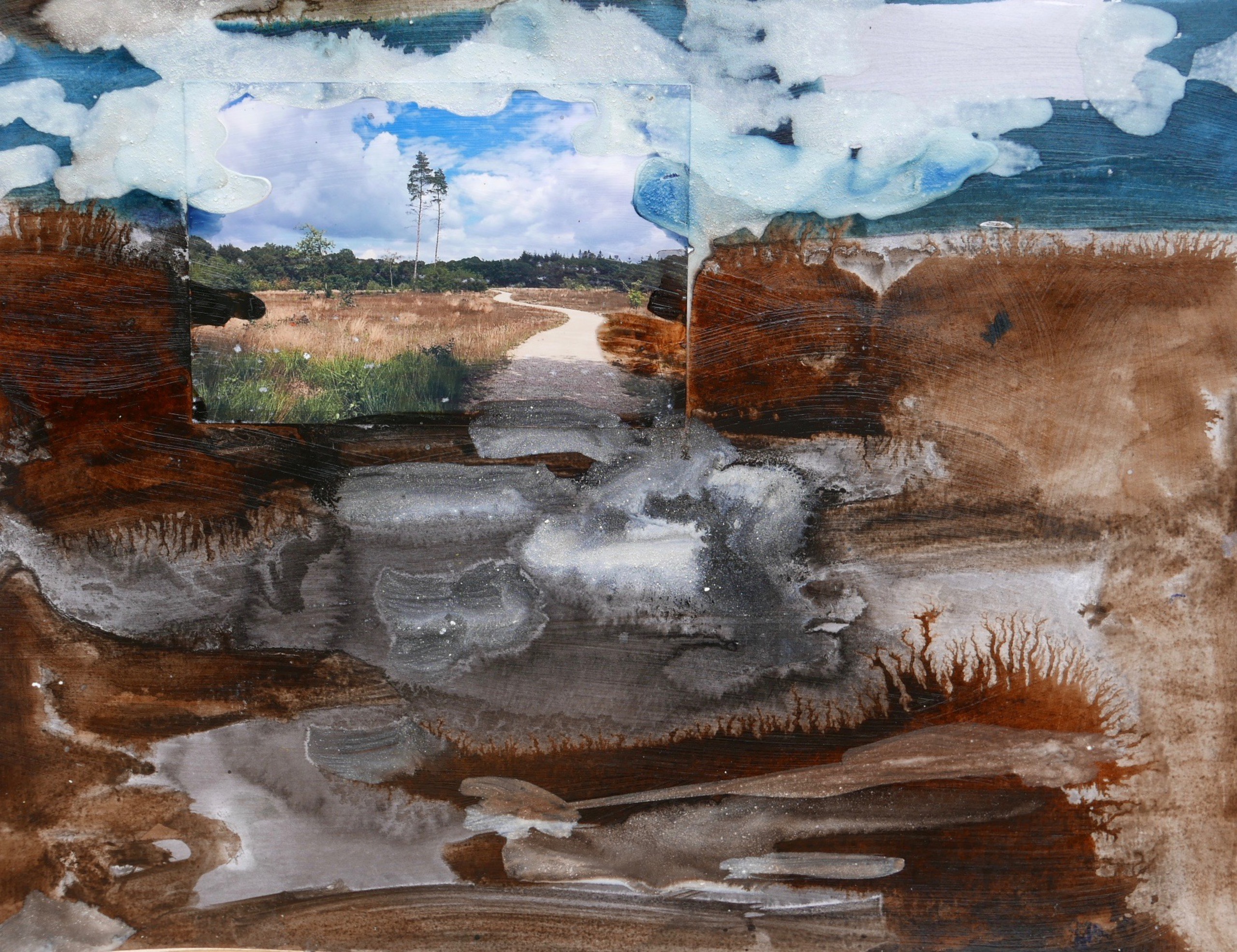 Mookerheide - natuurbegraafplaats - abstract - horizon - een foto als uitgangspunt - pigment en sumi-e op papier - vernis - 30x40 cm 2020 pigment gebonden met acrylaatbinder (en water)