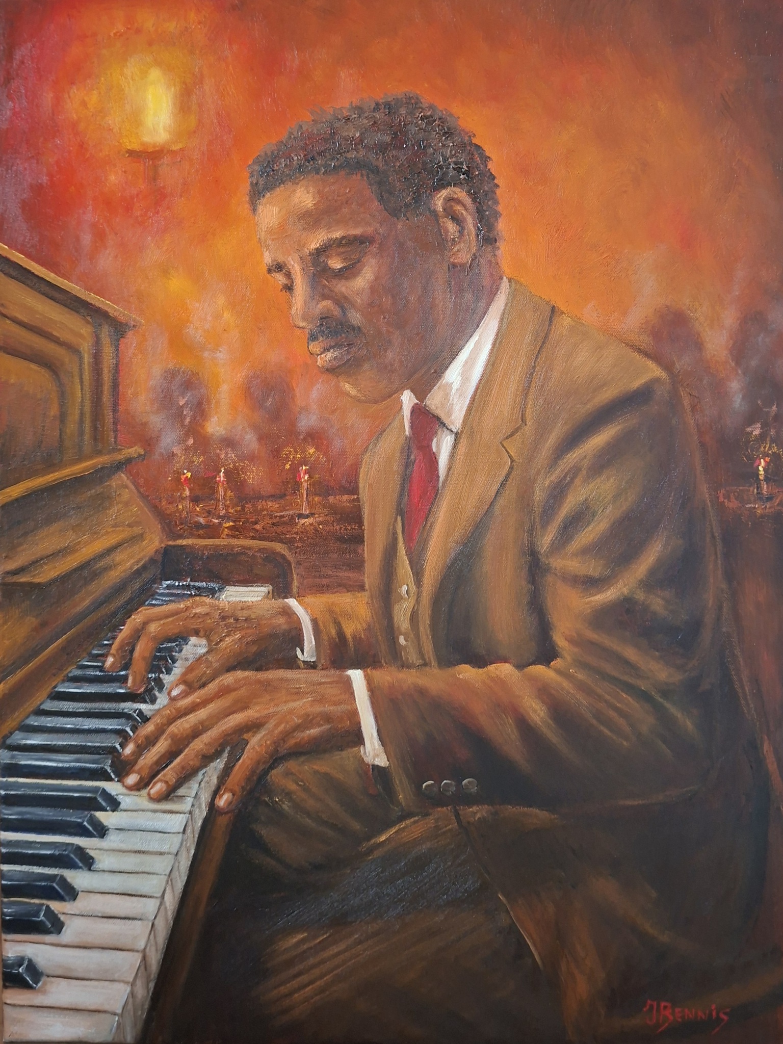 Jazz pianist. Feelings of Jazz. Olie op doek 70x50 inclusief zwarte baklijst.