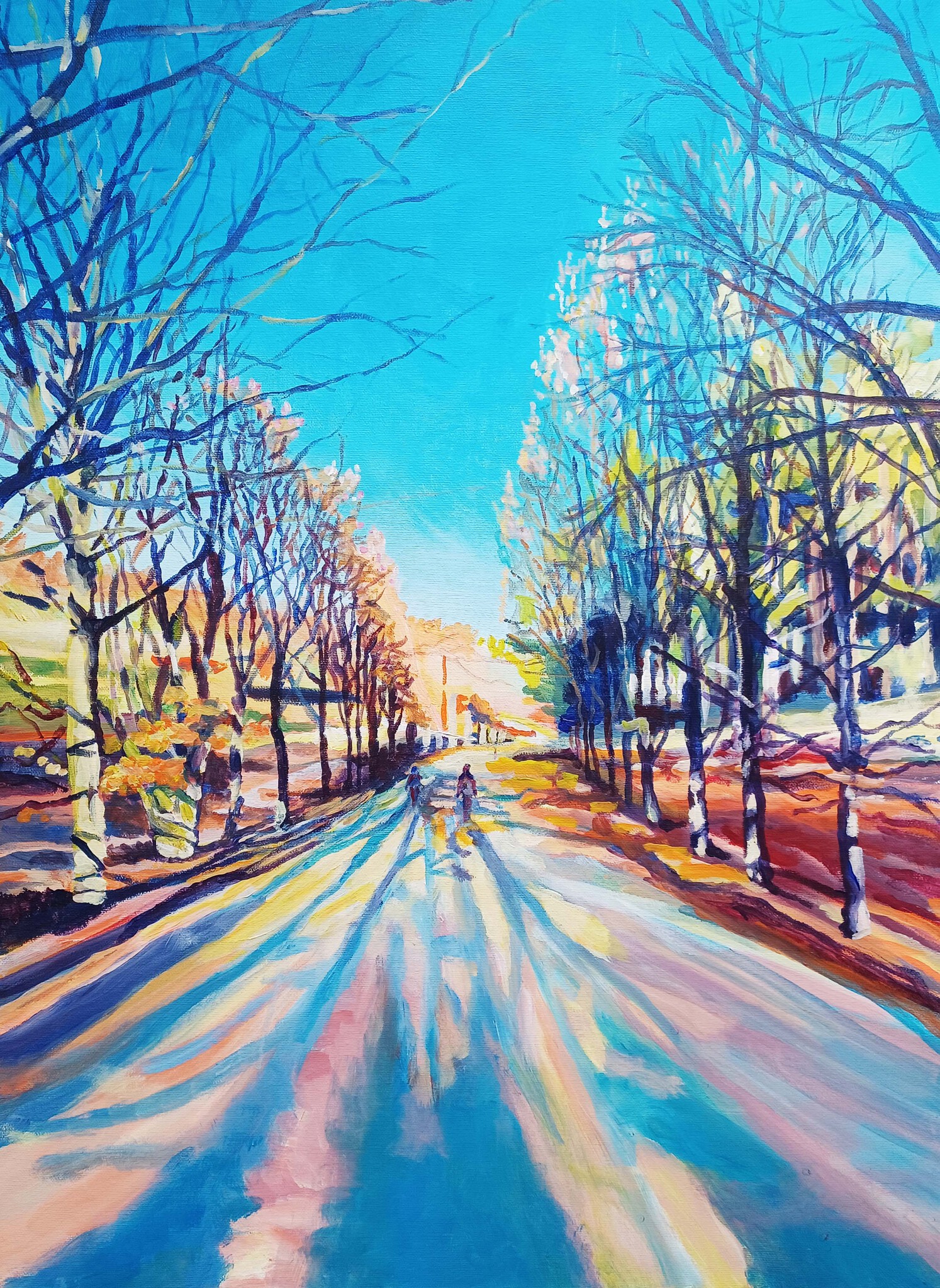 Surreeel Wandelaars Schaduw Blauw Licht Zon Laagstaand Paltz Bomen Pad Winter