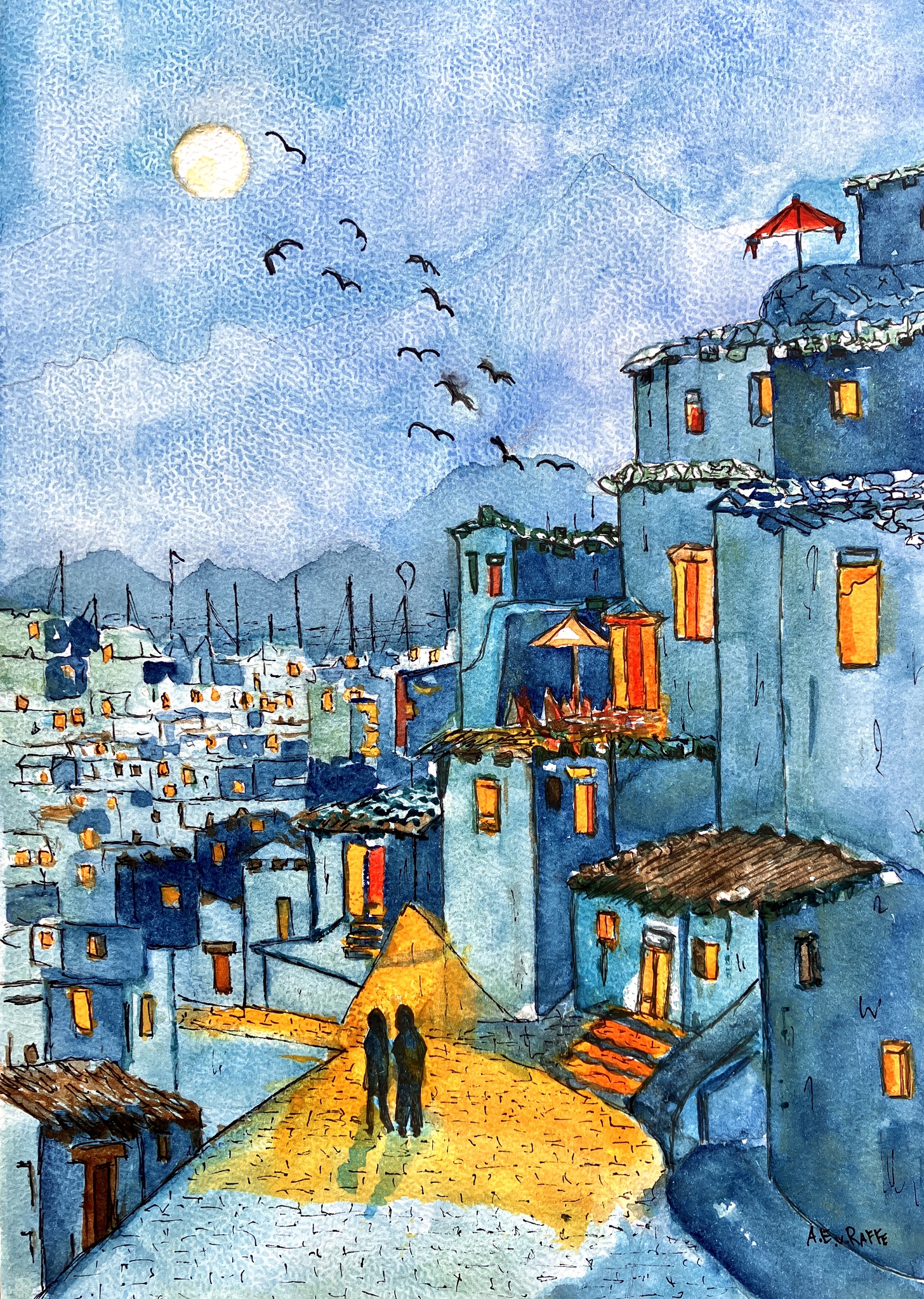 Aquarel Blue Sunny City Houses