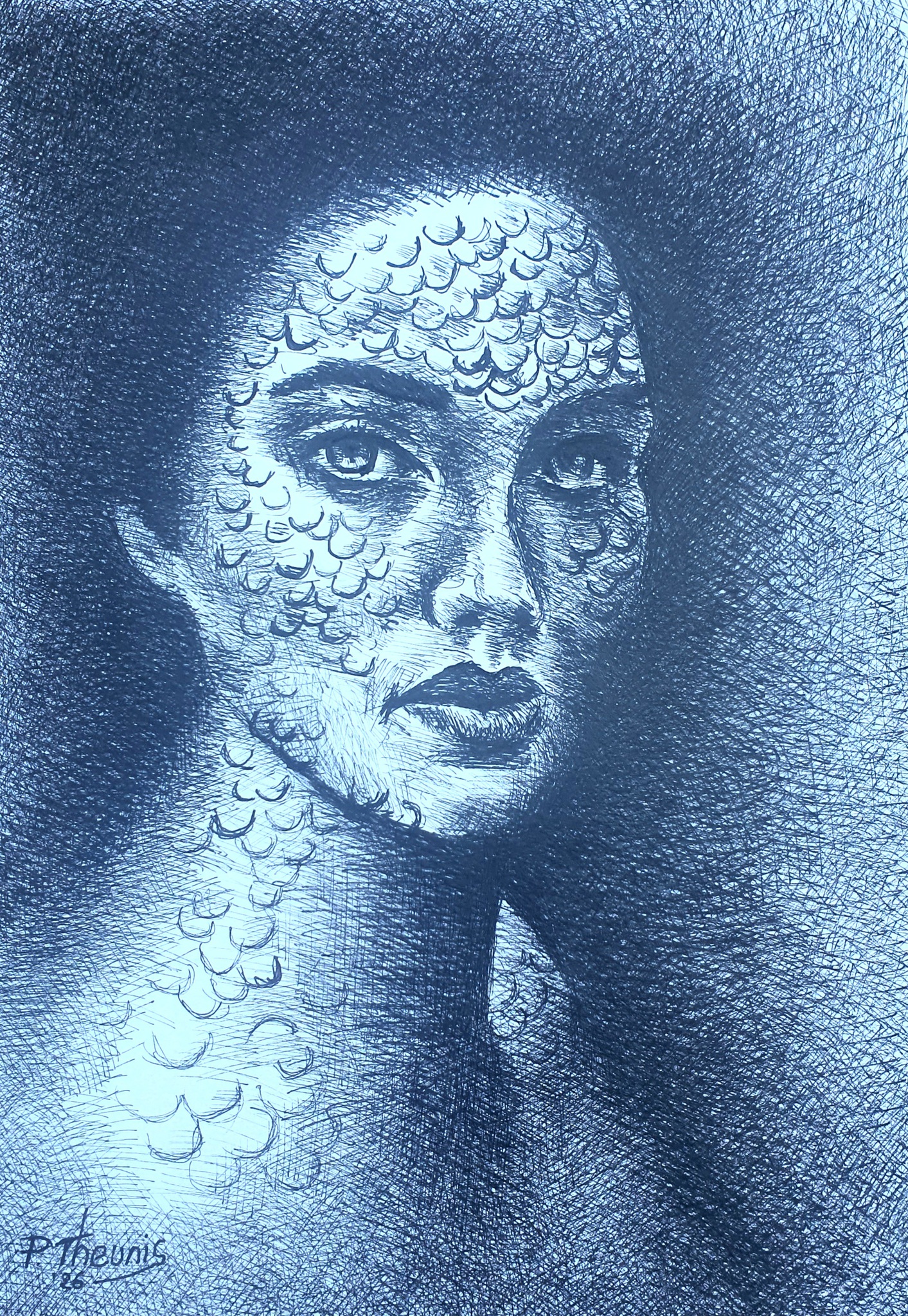 Eigen interpretatie van "een zeemeermin", uitgevoerd in inkt op papier.