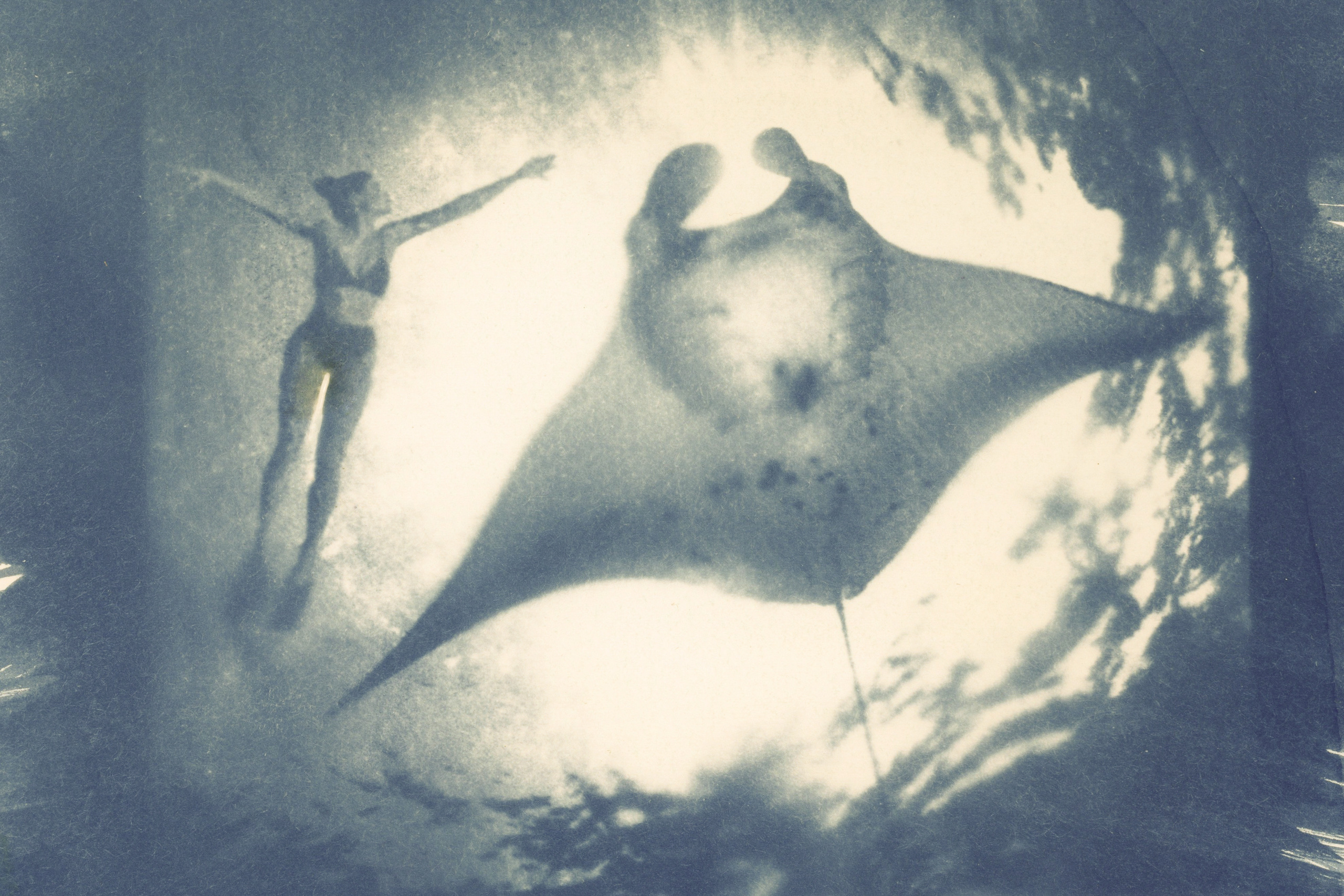 Zee Wildlife Art Mixed Media Handgemaakt Grafiek Marinelife Print Oceaan Ocean Zeedieren Minimalistische Mantaray Manta Reuzenrog Natuurkunst Zeewater Seawater Cyanotype Cyanotypes
