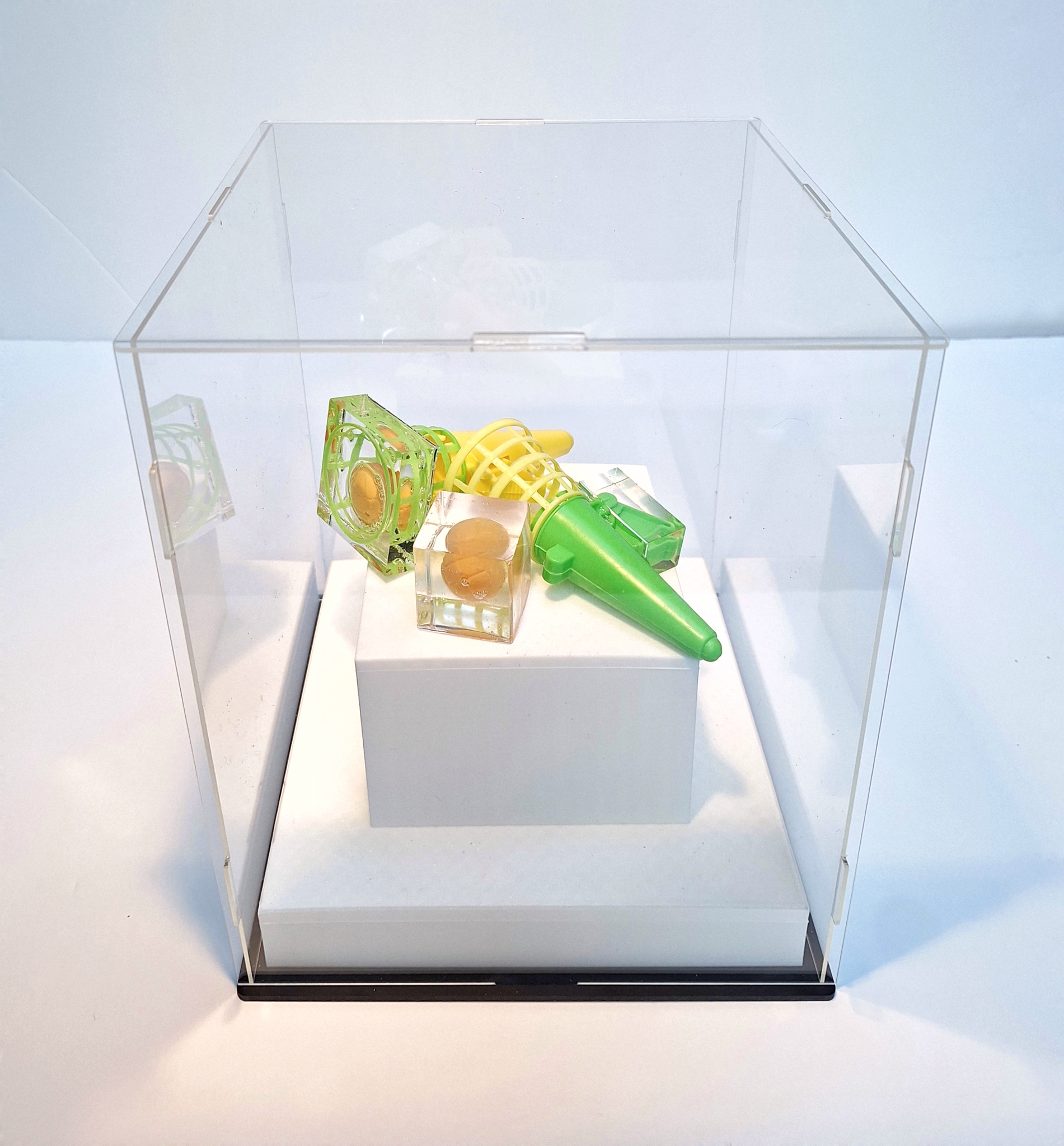 After the Game is a small sculptural installation based on a simple plastic toy designed to launch and catch lightweight balls. In its original form, the object requires movement, coordination and repetition: an action unfolds through a sequence of attempts, successes and failures. In this work, that dynamic has disappeared. The mechanisms are rendered inoperative through subtle interventions. One ball is permanently sealed inside a transparent resin cube. In one device, the launching mechanism is blocked by hardened resin; in another, the opening of the catching basket is obstructed by a resin form containing a second ball. The system remains visible, but can no longer function. The elements are arranged without a clear operational logic, as if they were left behind after use. This absence of direction shifts the work away from demonstration and toward a condition of quiet suspension. The toy no longer performs; it persists. Presented on a minimal pedestal and enclosed within a transparant vitrine, the installation assumes the status of an artifact. The materials - plastic and resin - retain the visual language of play while withholding its activation, imbuing the work with a quiet sense of melancholia.