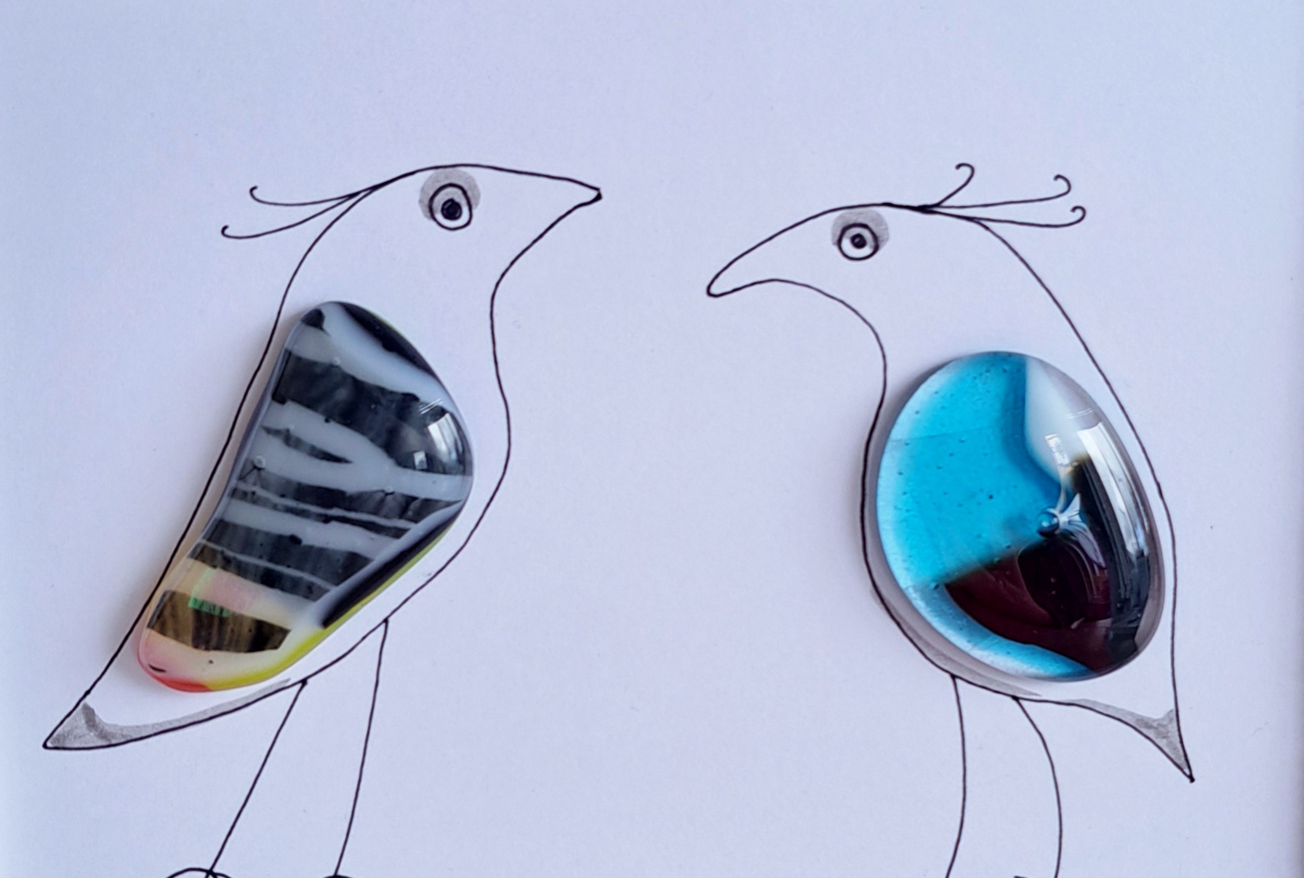 Gestyleerde vogels met puddles van glasfusie. Ingelijst in witte lijst van ruw hout.