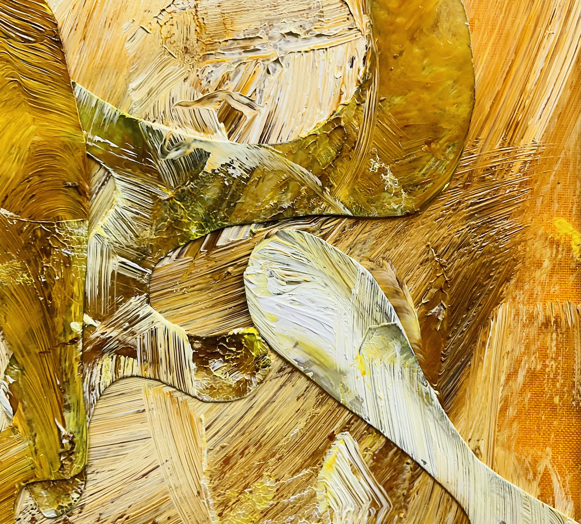 Melodie Flows vertaalt klank naar beweging in warme goud- en okertinten. Dikke verfstreken en vloeiende lijnen creëren een ritmische, bijna tastbare stroom.