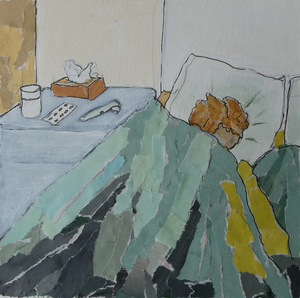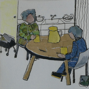 In de stoel bij de tandarts. Uit de serie Dagelijks leven. Werk op papier in mixed media