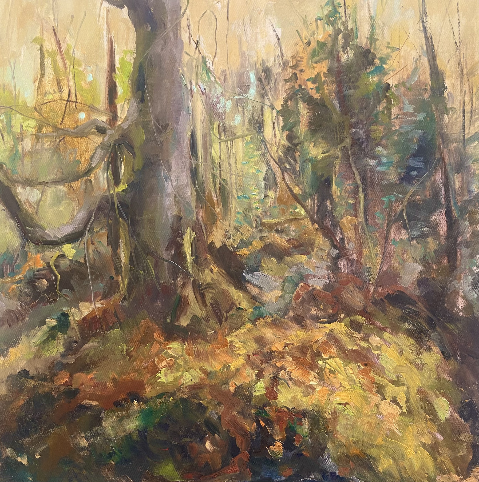 Ochtenlicht in het bos, 2026 Olieverf op doek | 50 x 50 cm Pleinair