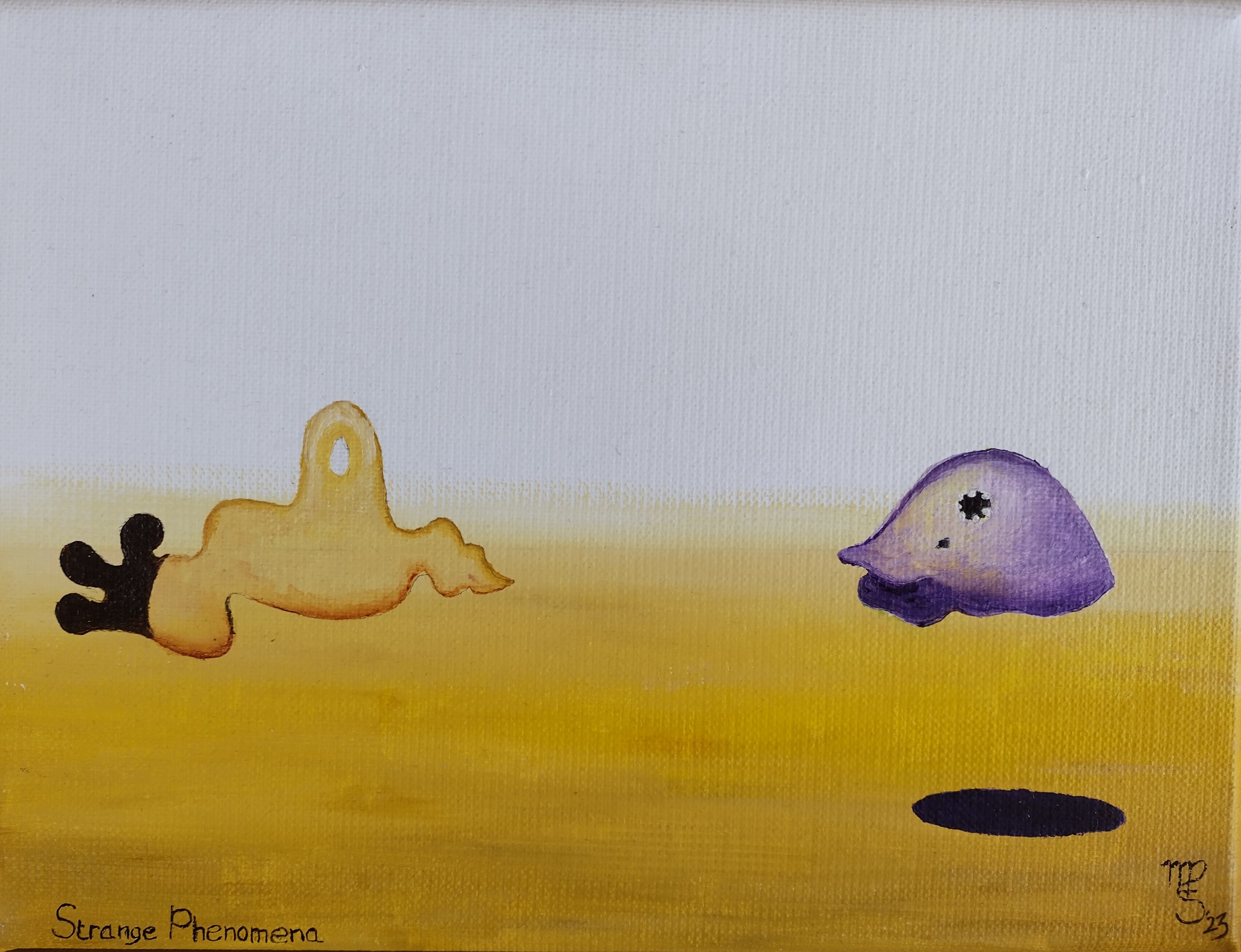 Een geabstraheerde kop van een watervlo (Daphnia obtusa) duikt hier voor het eerst op in mijn werk. Op zoek naar nieuwe vormen kom ik uit bij watervlooien (Cladocera), mijn specialiteit als zooplankton deskundige. Geschilderd met de song Strange Phenomena (Kate Bush) in gedachten.