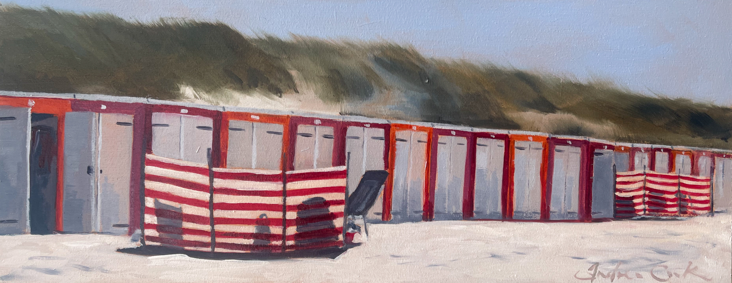 Strandhuis tafereel met gestreepte windschermen