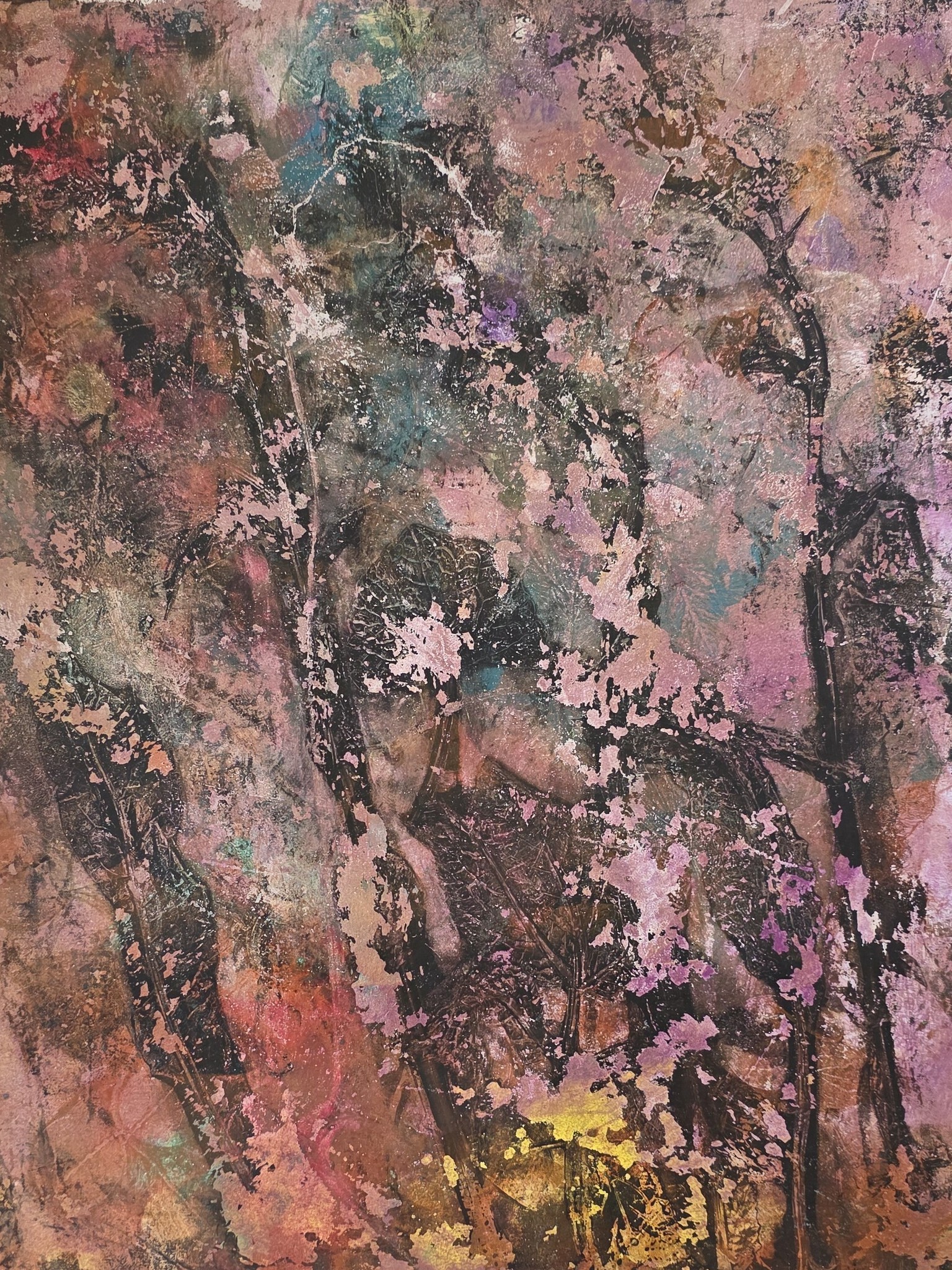Een monoprints, zo blijft het heten, ondanks dat dit beeld bestaat uit meerdere lagen. Acryl op 150 gram papier, een cosmos om in weg te dromen.