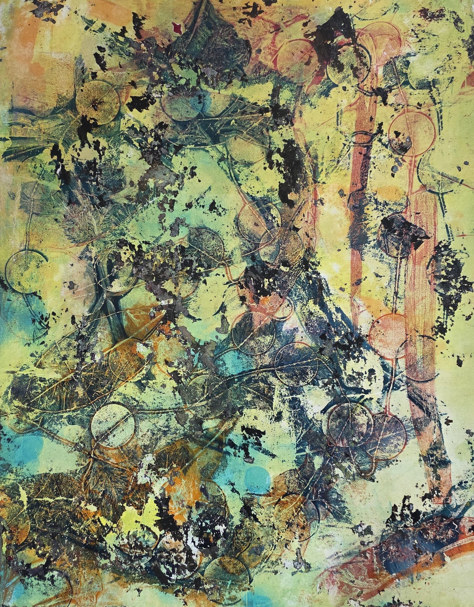 Geel is zonnig, geel geeft mij altijd een feestelijk gevoel. Verschillende lagen op de plaat en 1 drukgang een monotype wordt dat ook genoemd. Het is spelen met kleur en vorm en wachten op de verrassing.